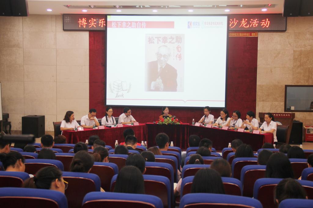 2019年6月12日晚上,我校学术报告厅灯火通明,热闹非凡,一场名为“共读好书,遇见更好的自己”读书沙龙如期在这里隆重开幕。报告厅里,分享者和主持人在台上绕花团团而坐,整个场面雅致而热烈,让观众对接下来的饕餮盛宴油然生出几分期待。