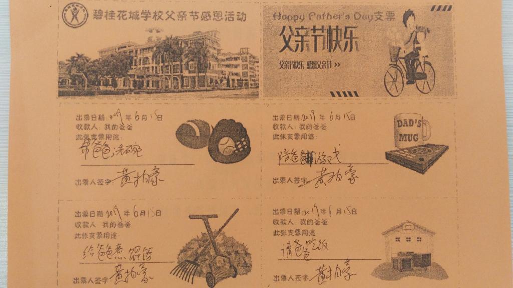 2019年的父亲节,为了培养学生的感恩意识,博实乐碧桂花城学校德育处精心印发了父亲节支票,每个学生都有四张表达爱的支票用来送给父亲,来实现父亲的节日愿望,以实际行动来回报父亲的爱。
