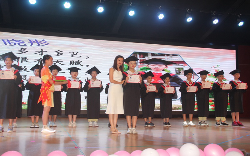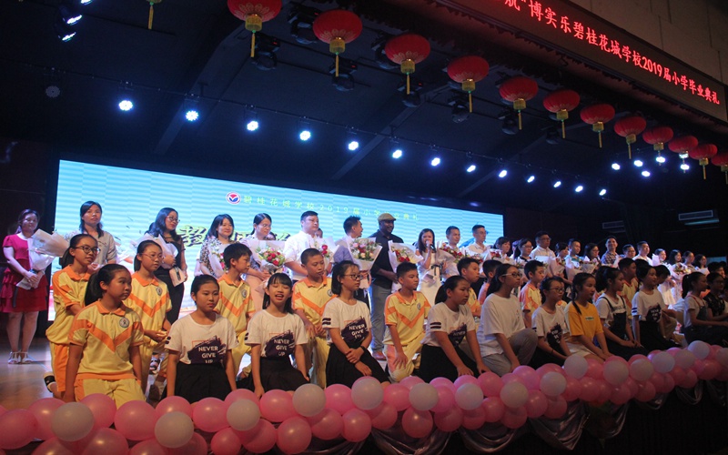最后,伴随着何老师的一曲饱含深情的歌曲,五十多位教师缓步走上舞台。学生代表们手捧鲜花献给6年来一直陪伴和教育自己的老师。老师们也为全体毕业生送出了情真意切的祝福。孩子们真情流露,道不完的千千万万个感谢。老师们也潸然泪下。师生依依不舍的真情演绎把毕业典礼的氛围推向了令人难忘的高潮。毕业典礼在师生齐唱校歌《梦想花城》中圆满结束。