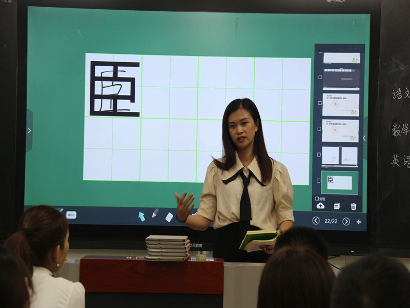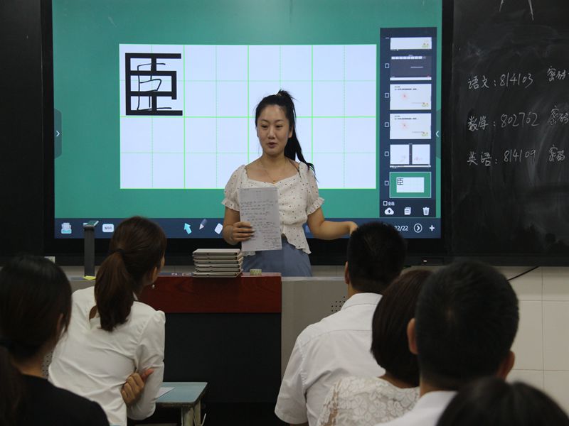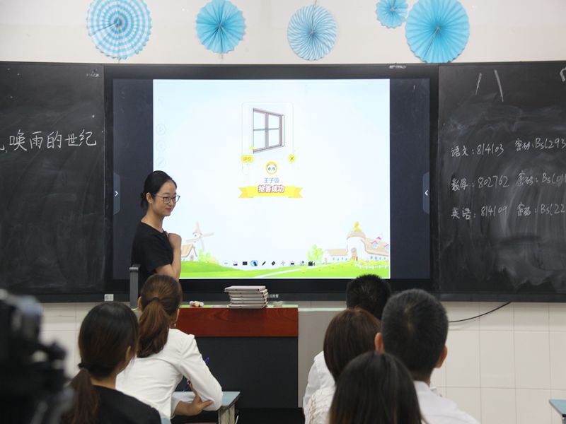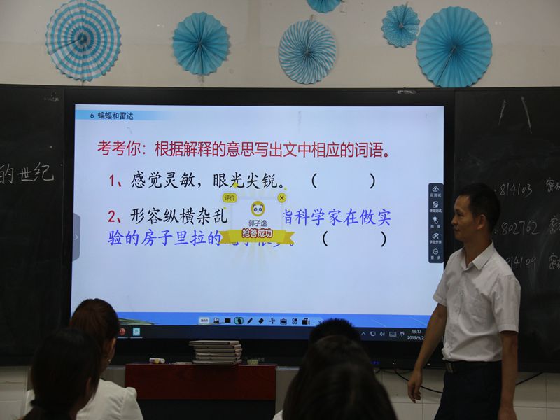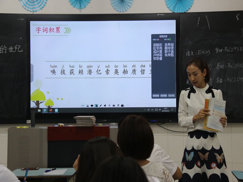 这次汇报课上最引人注目的还是老师们对新技术的运用,授课时使用的设备是北京北师智慧科技有限公司提供的智能化教学系统。在授课过程中,老师们娴熟地使用了批注、个人评价、主观题和客观题测试、抢答、随机选人、汉字书写、尺规画图、小组积分等技术,使课堂既有趣、高效,又能巧妙地凸显个人风格。
