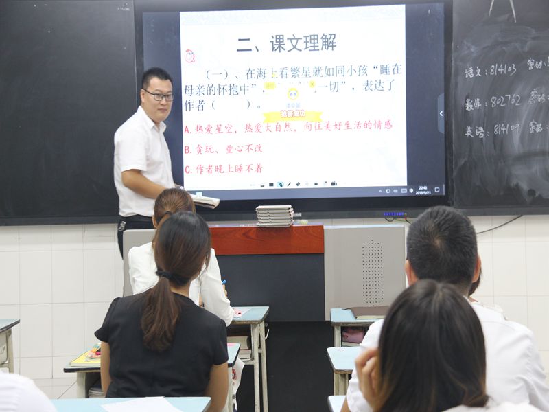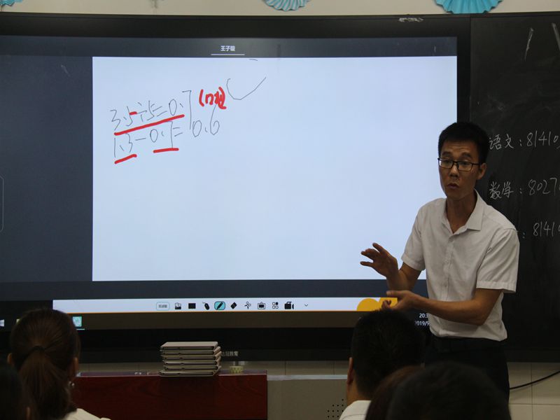 9月23日晚上6点40分,参与“智慧课堂”建设的首批11位老师汇聚在四(3)班教室,进行了一场阶段性的课堂教学汇报活动。授课的老师来自于四、五年级,讲授的分别是语文、数学、英语三个学科的内容,每人上课时间约为8分钟。时间虽短,但老师们的表现却是个个精彩纷呈。谢梅嫦老师非常关注课堂的生成,她能抓住课堂反馈信息,即时提出新问题;陈淑婷老师虽然是一位新教师,但是授课非常沉稳,各环节过渡自然,表达准确清晰;李家宝老师的评价独具一格,他用笑脸代替了平时老师们常用的“√”或“×”,让人感到非常亲切……