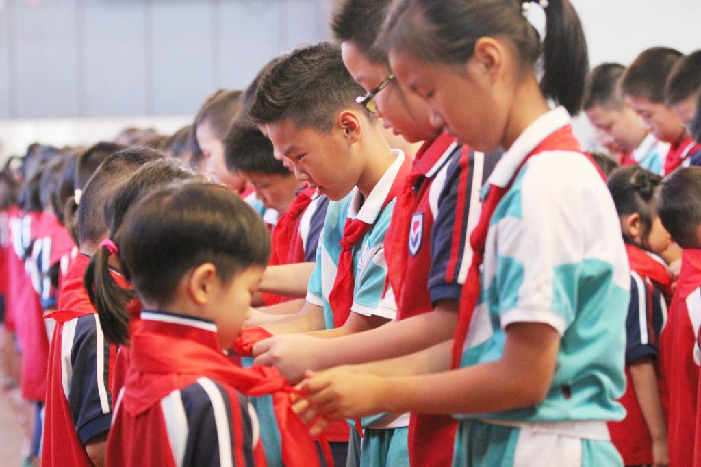仪式上,四年级和五年级的少先队员们郑重地为新队员系上鲜艳的红领巾,同时还在仪式上做了敬队礼示范,带领新队员正确地敬队礼。大队干部带领新队员在队旗下庄严地宣誓。