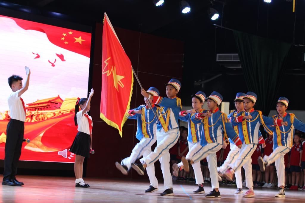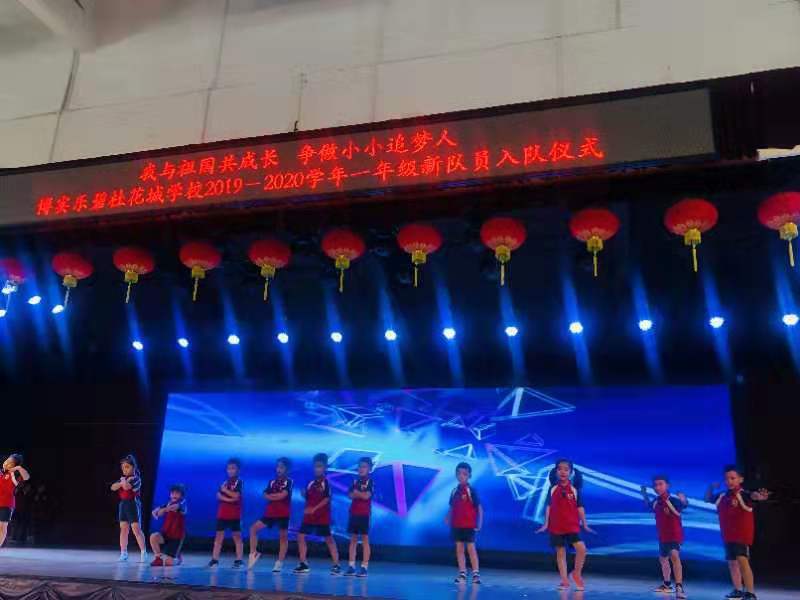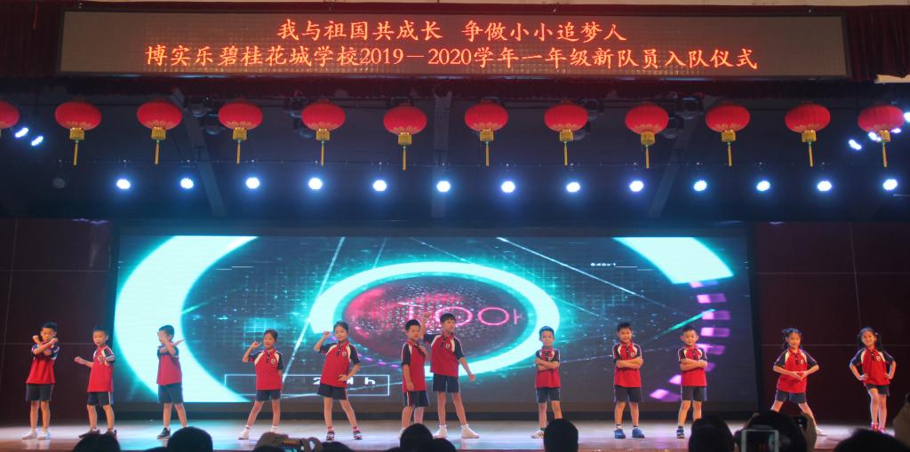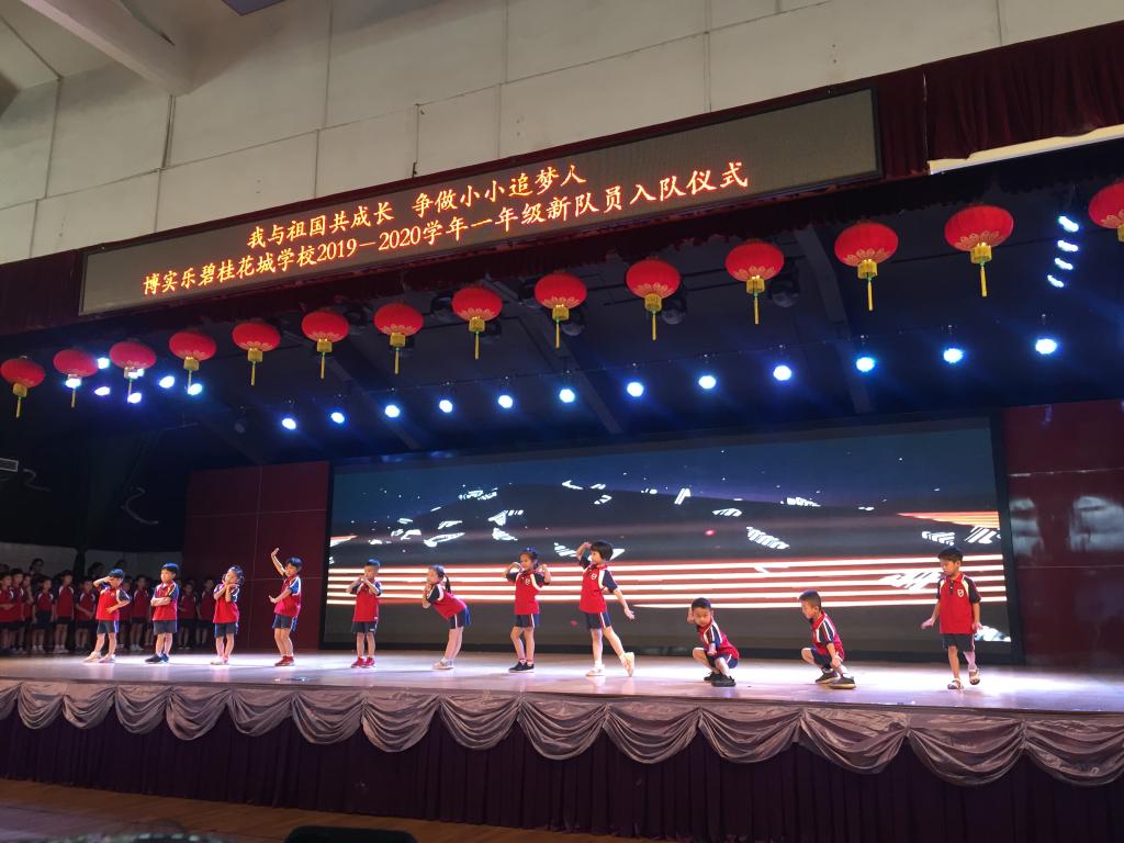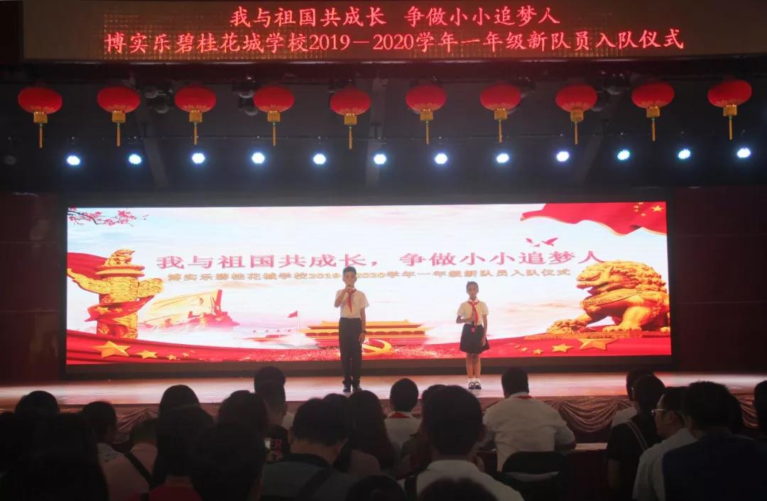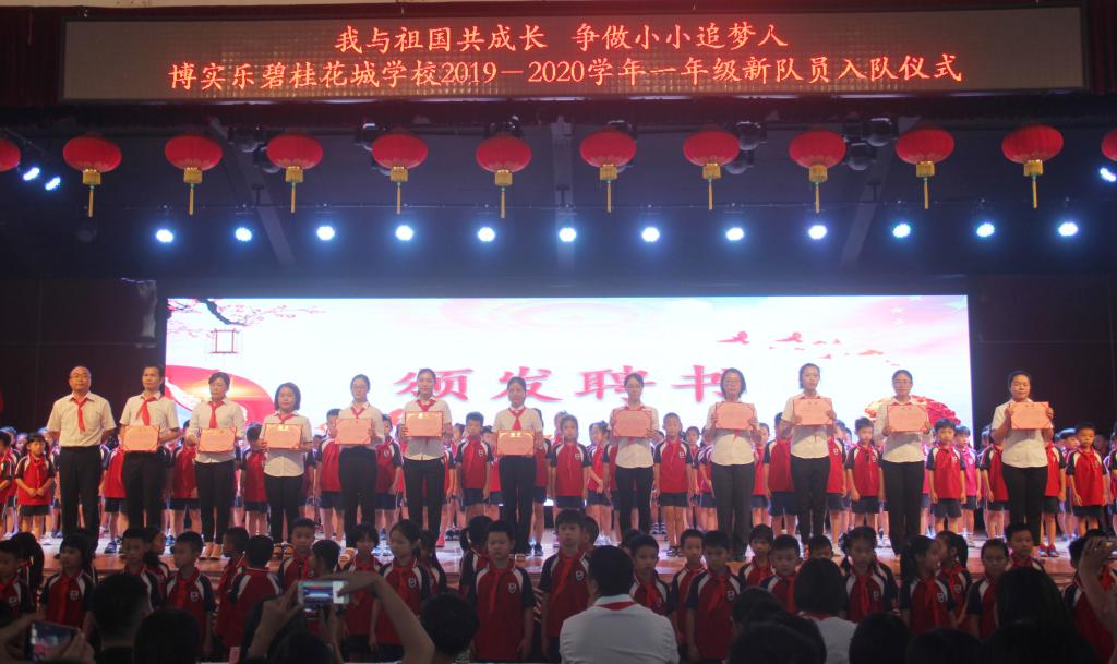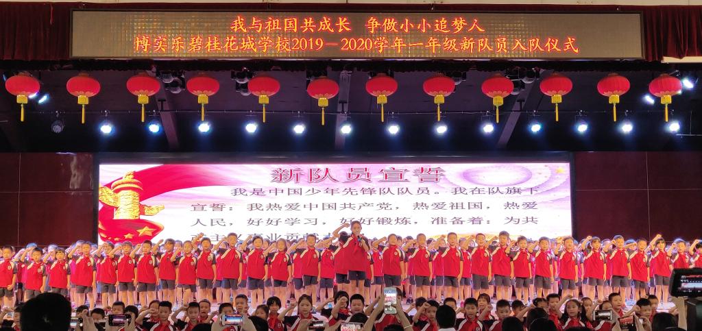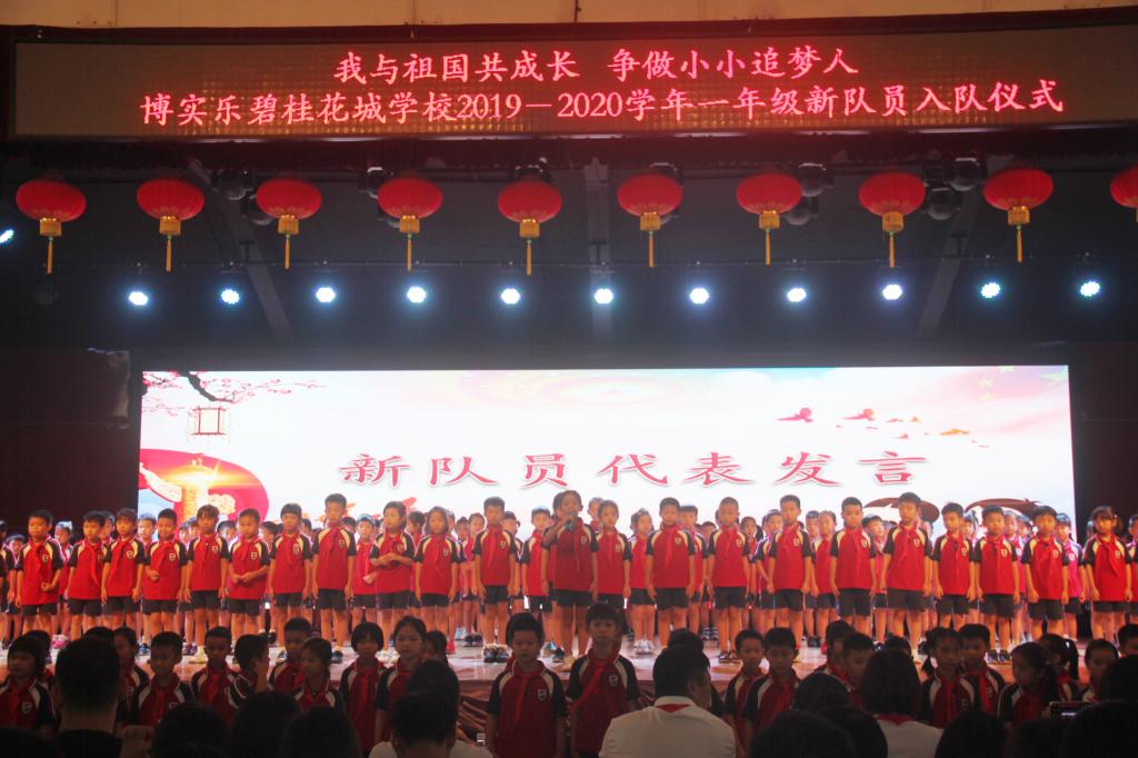 为了引导少先队员继承和弘扬革命先烈的光荣传统,增强少先队员的光荣感和自豪感,在中国少年先锋队建队70周年之际,博实乐碧桂花城学校于10月18日下午举行了“我与祖国共成长,争做小小追梦人”为主题的少先队入队仪式。一年级250名同学以自己良好的表现通过考核,加入了中国少年先锋队,为少先队组织输入了新鲜血液。新的七个中队也在庄严的队旗下成立。