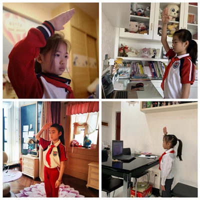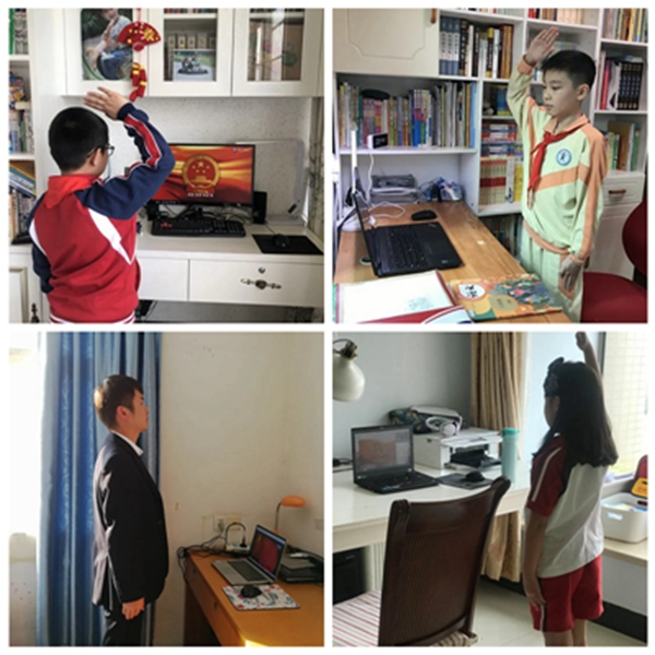“起来!不愿做奴隶的人们,把我们的血肉筑城我们新的长城……”早上9:00,伴随着庄严肃穆的国歌,全体花城师生起立,面向国旗行注目礼,少先队员行队礼,齐唱国歌。花城师生用行动告诉大家虽然我们不能到校参加升旗仪式,但花城师生爱国的心从不间断。