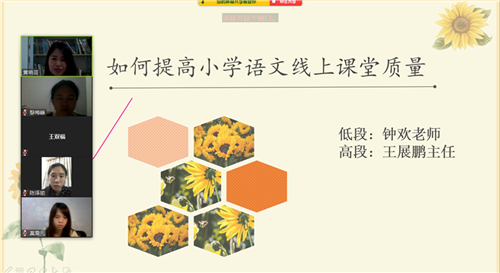 本次会议由低段的钟欢老师和高段的王展鹏老师为代表,分别进行了“如何提高小学语文线上课堂质量”的经验分享。两位老师分别从线上教学现状、主要做法、存在问题、解决方法等方面进行了深入地分享,既引起了所有老师线上教学的共鸣,也为老师接下来的教学思路提供了可行的方法。