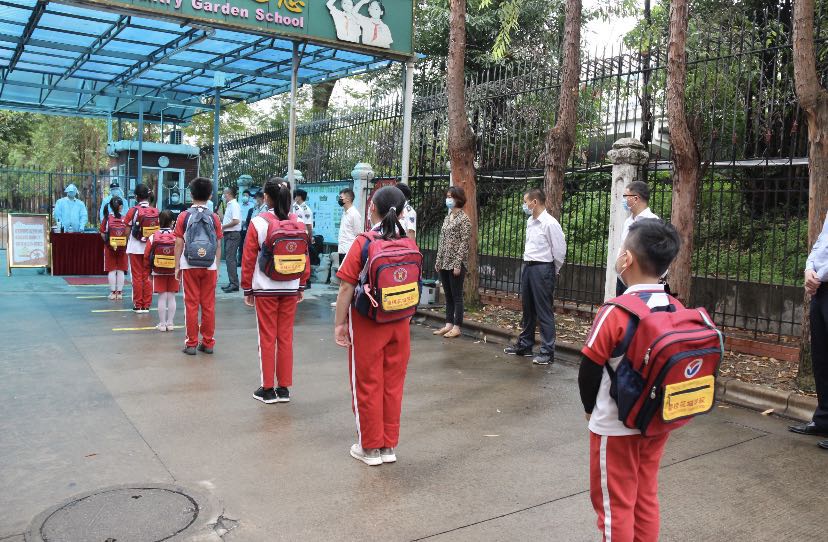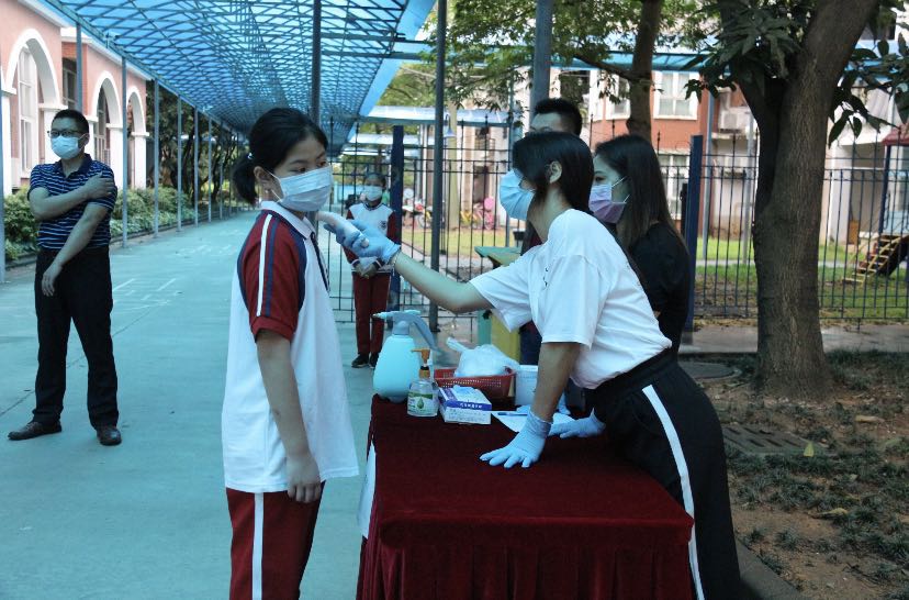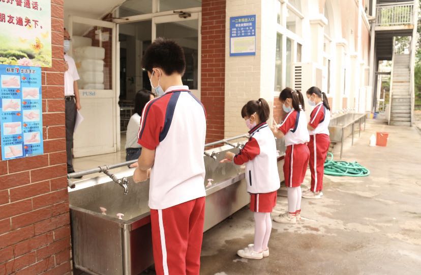 入校前,学生在指定位置间隔1米以上,出示健康表(含家长签名的承诺书),依次排队有序测温、洗手(免水洗手液),体温正常方能进入校园。