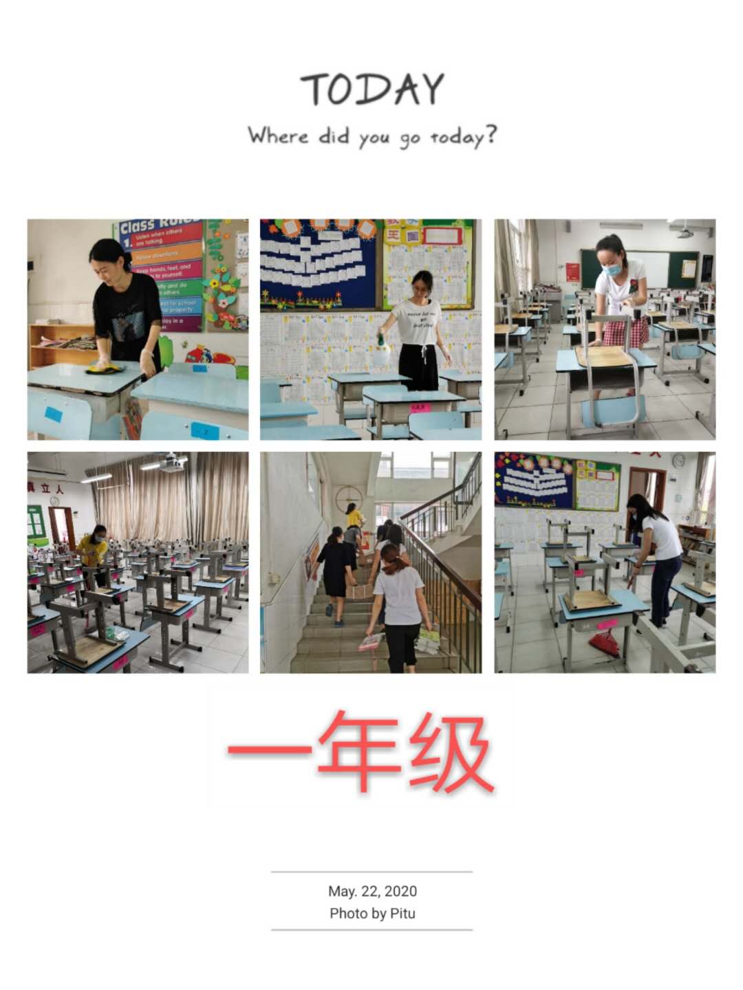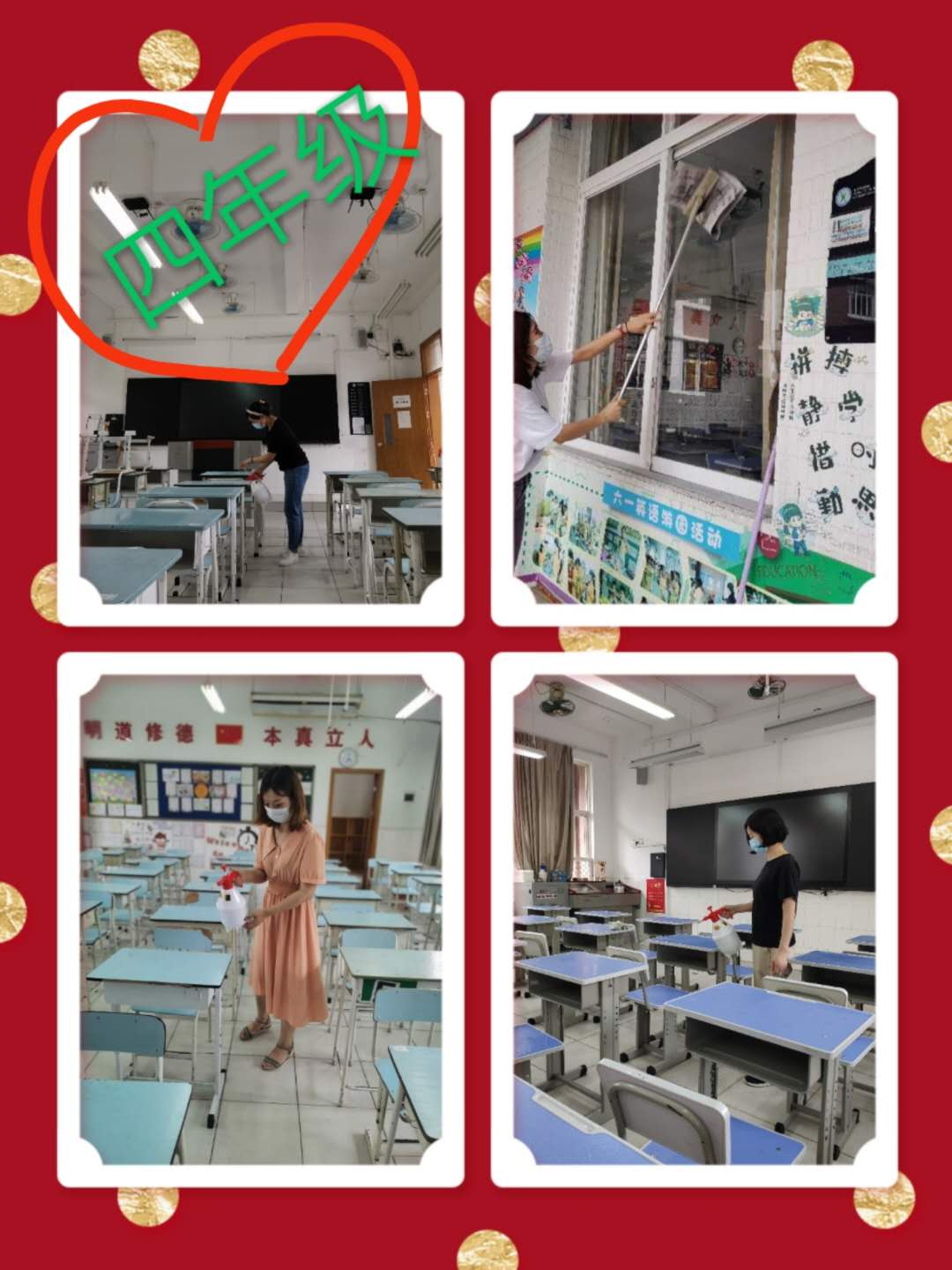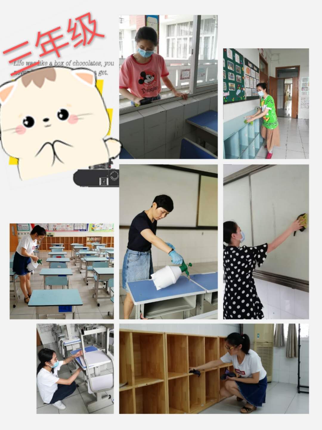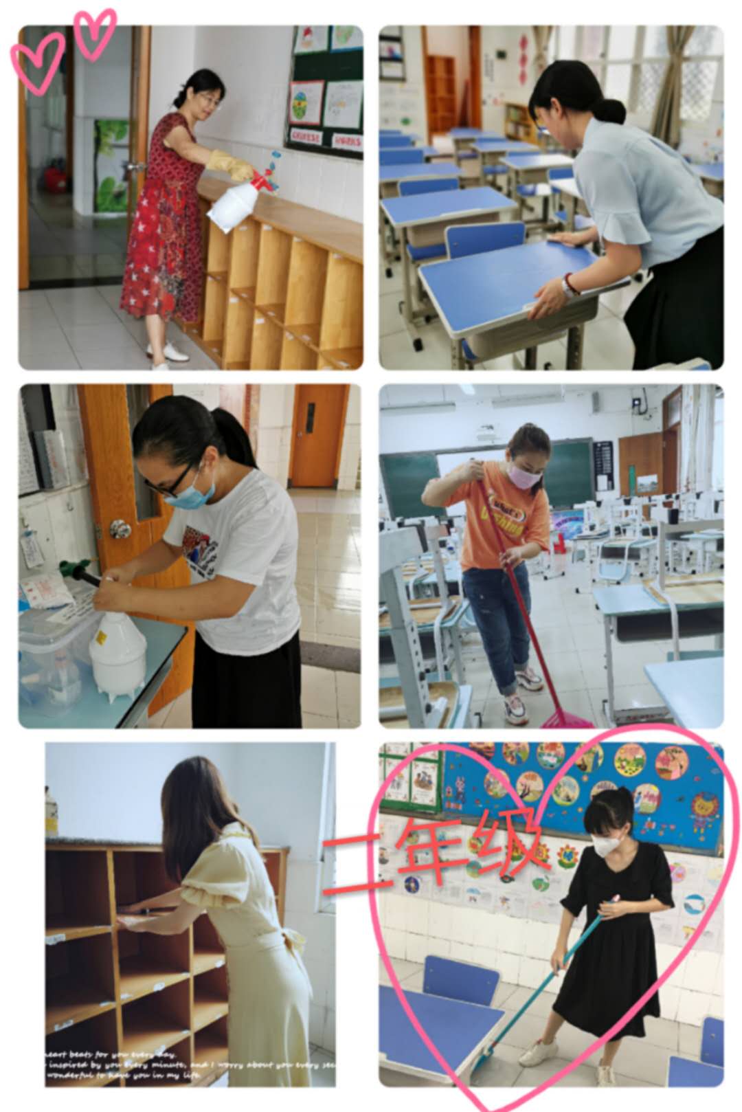 会后,老师们按照洪医生的要求开始忙碌起来:扫地、拖地、擦桌椅、消毒、布置教室……汗水模糊了眼镜,浸透了口罩,但老师们毫不在意,依旧干劲十足,似乎要把这几个月来对孩子们的想念一股脑儿通过劳动的方式表达出来。