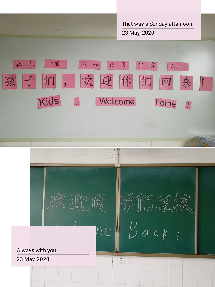 瞧!锃亮的地板、整齐的桌椅、干净的门窗,还有黑板上“欢迎同学们返校”的标语无不蕴藏着老师对孩子们的爱意。