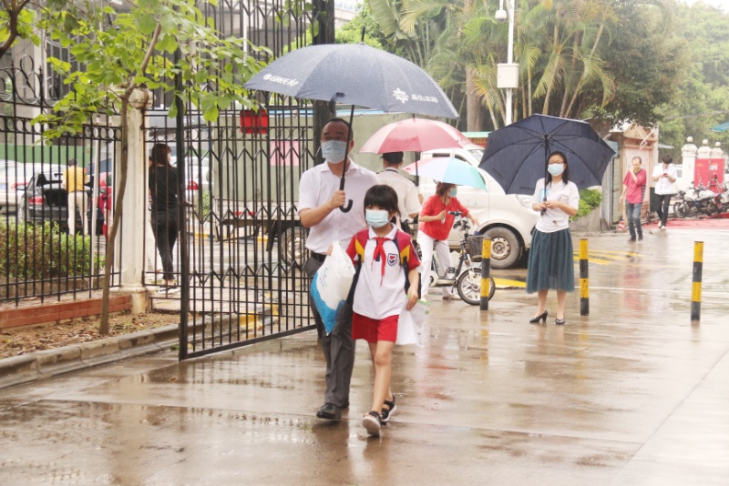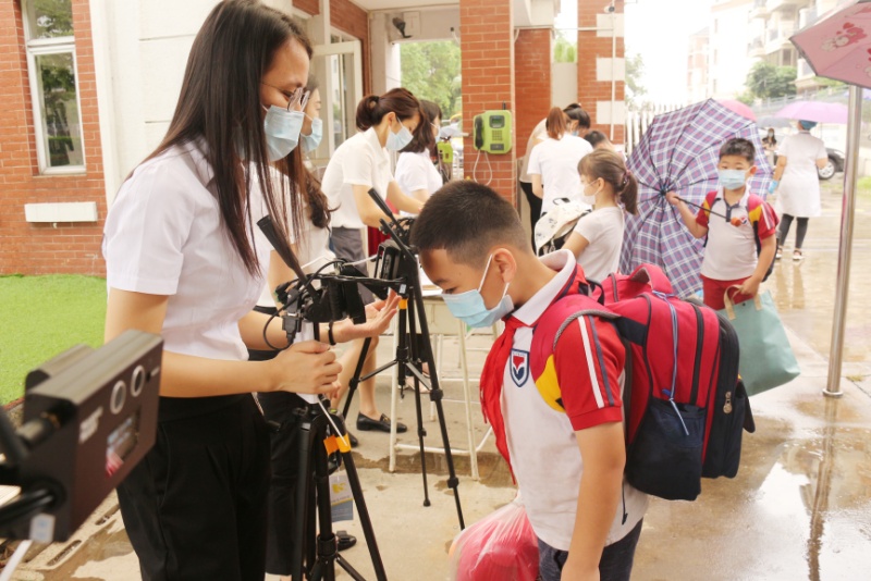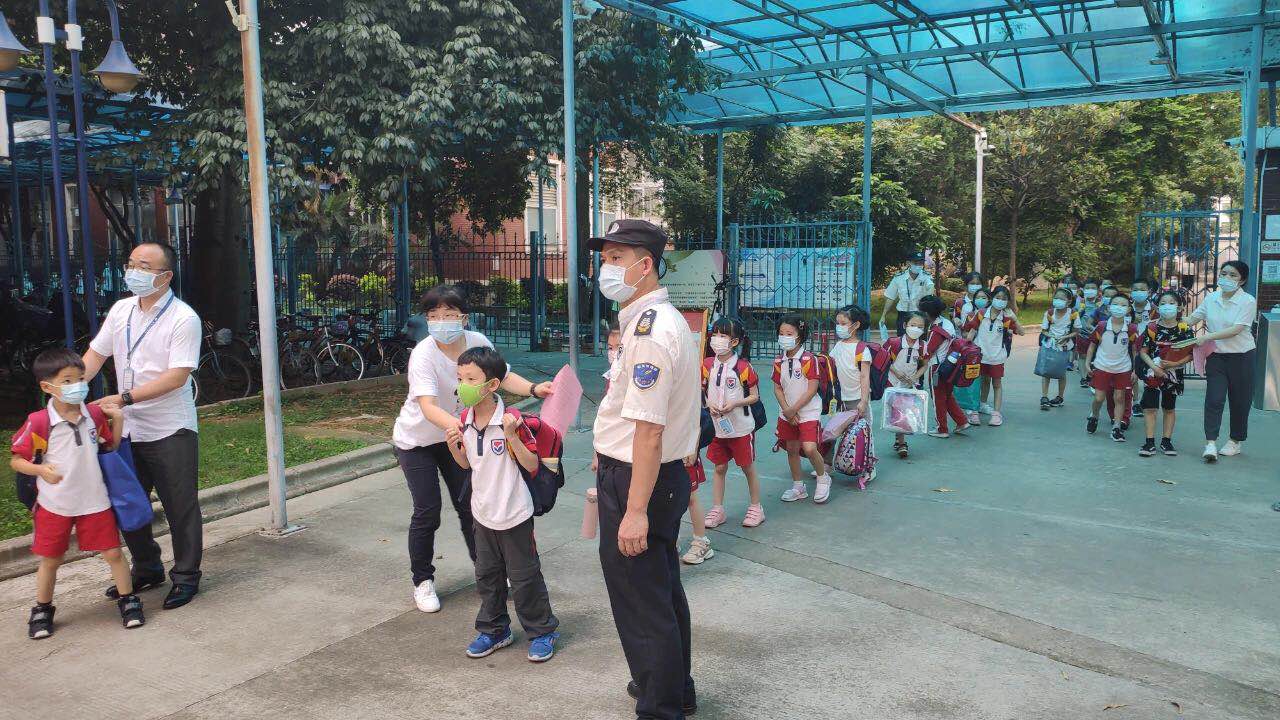 7点刚过,按照错峰时间,孩子们如期而至。看到校长、老师、医生、警务人员早早就严阵以待,守候在校门口的“关卡”处迎接,孩子们不由放慢脚步,整齐有序地踏着地上的标识、通过电子体温检测仪步入校园。口罩遮住了活泼的笑脸,却遮不住雀跃的心。一声声响亮的“校长好!”“老师好!”让寂寞了几个月的校园顿时热闹起来。