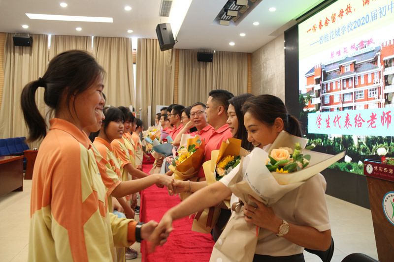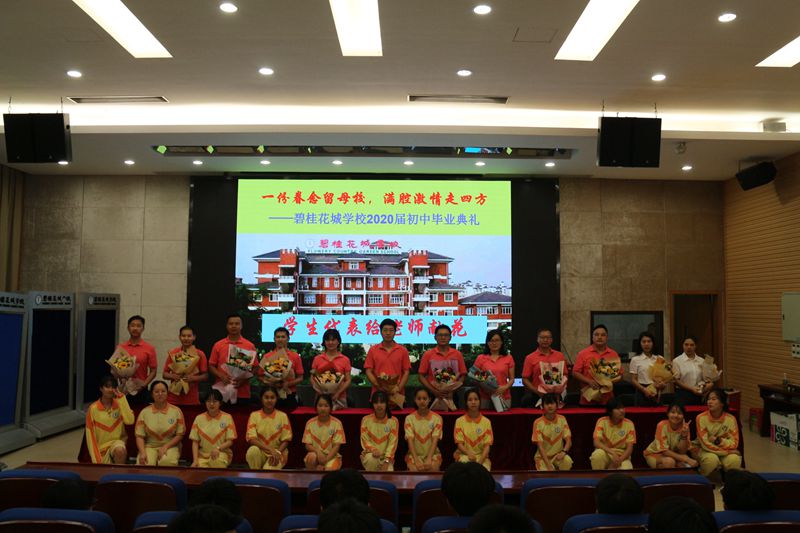 这是碧桂花城学校最后一届初中毕业班,今天的毕业典礼因而也更显得意义非凡。在激昂的音乐声中,12位同学手捧鲜花,送给三年来辛勤付出的老师们,表达对老师们最深切的祝福和最真挚的感谢。