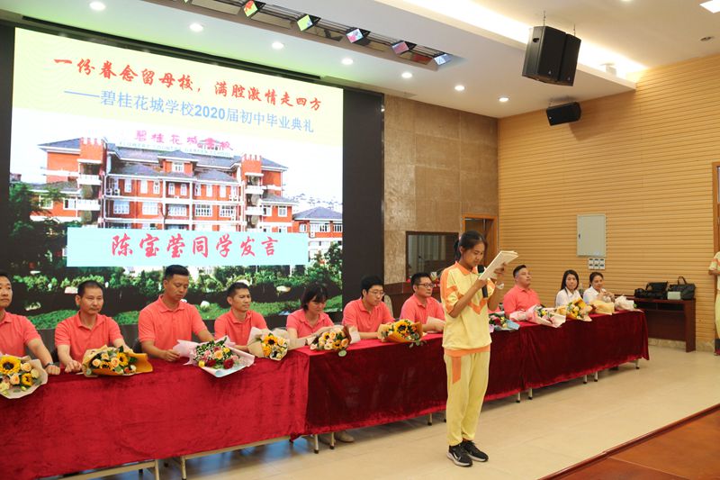 接着,学生代表陈宝莹同学饱含真情地回忆了三年来在花城的学习和生活,用哽咽的语言表达了对老师的感恩之情和对母校的依依不舍。