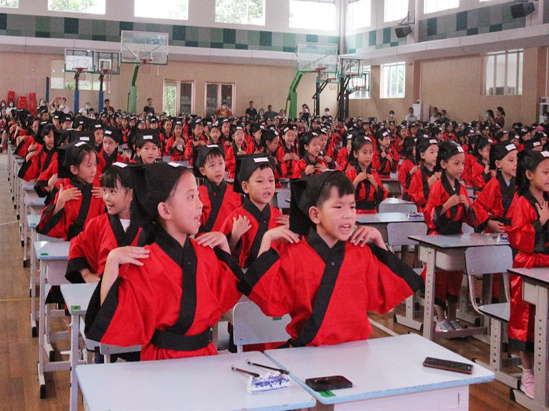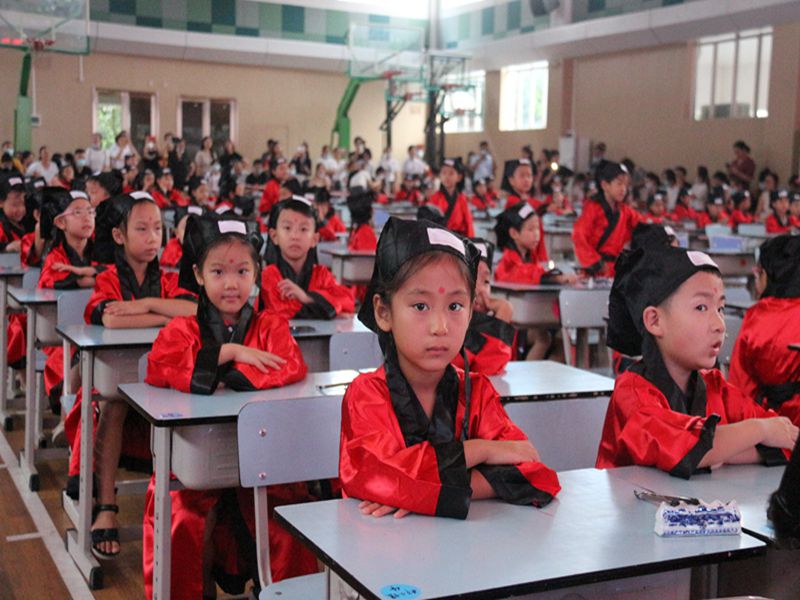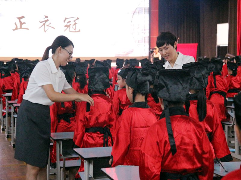 下午三点半,在贺校长的致辞声中“开笔礼”拉开了序幕。孩子们先自正衣冠、互正衣冠,最后师正衣冠,目的就是告诉孩子们“衣冠不仅仅意味着遮羞,更重要的是反映人的精神面貌,所以要先正衣冠,然后才能明事理。”