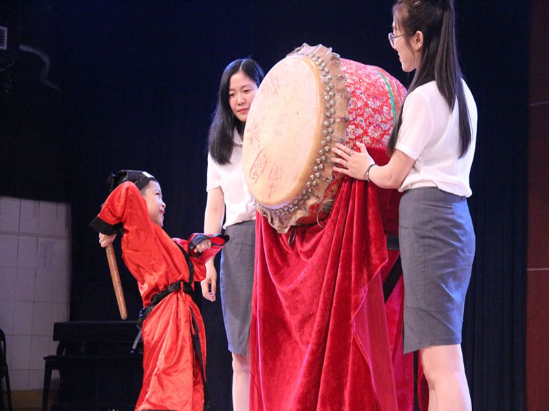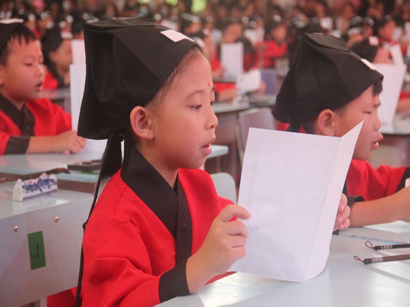 开笔礼一共分为“正衣冠”、“拜师”、“朱砂启智”、“击鼓明志”、“描红”、“诵读经典”六个环节。