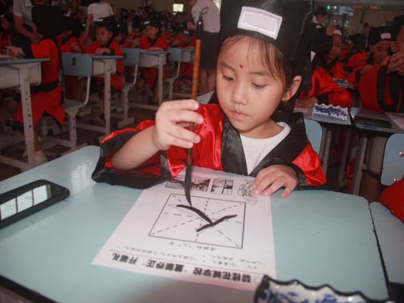 “正衣冠”、“启智”、“明志”之后,孩子们起笔描红,在老师指导下学习写“人”字。之所以选择这个笔画简单而意义深远的汉字,是希望孩子们在人生的启蒙阶段学会做人,知道做人首先要堂堂正正地立身,要像“人”字那样顶天立地。
