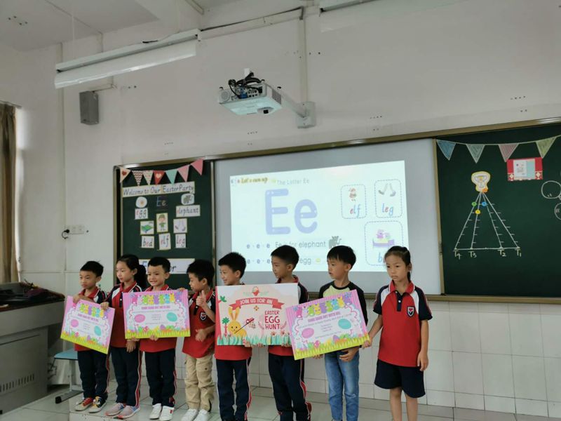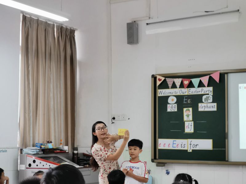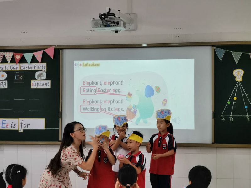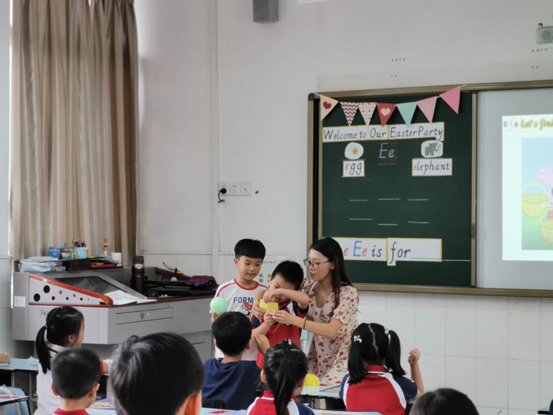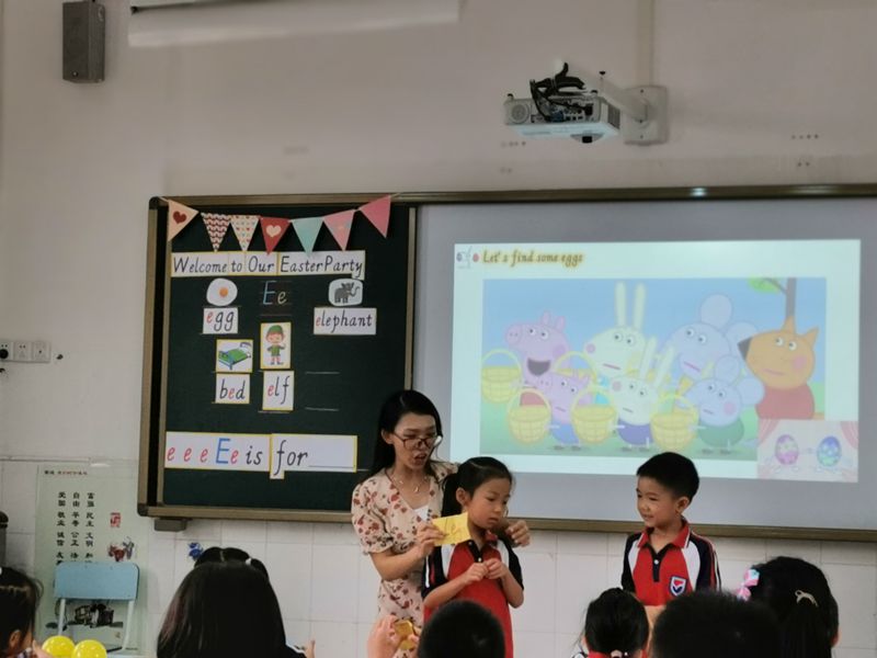 梁老师这节课的主题是《Welcome to Our Easter Party》。在这节课中,梁老师以创设情景为主要基调,充分挖掘并运用教材的内容。首先,她以活动Easter Party引入,充分激发学生的学习积极性,带领学生进入课堂学习,并以此来引出今天的学习内容字母E。第二部分中,梁老师用PPT展示了课本部分内容,并让同学们带着问题听录音,完成了Listen and choose。录音中所涉猎的题目层次分明,由易入难,层层深入,可见梁老师备课之细致。第三部分是活动环节——找彩蛋,找彩蛋的过程让孩子们在玩中学,既提高了他们的学习积极性,也运用和拓展了新知识,可谓一举两得。本节课中,孩子们全情投入,积极参与,课堂气氛特别活跃。更为重要的是梁老师那甜美的声音,自然亲和的教态,深深地吸引着孩子们,也感染了所有的听课老师。