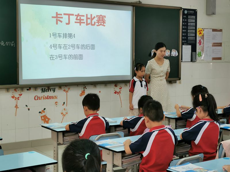 课堂上,黄老师在揭示课题后引导学生在森林运动会和卡丁车比赛中探究动物之间前后的位置关系。学生在有趣的“我说你猜”环节中寻找身边的“前后”,在“比比谁的反应快”环节中争前恐后地抢答,在激烈的卡丁车比赛中,感受“前后”带来的荣誉感……学生们积极参与学习,课堂气氛特别活跃。黄老师用她清晰的教学思路和精心的活动设计,让学生在玩中学,学中玩,并乐在其中!