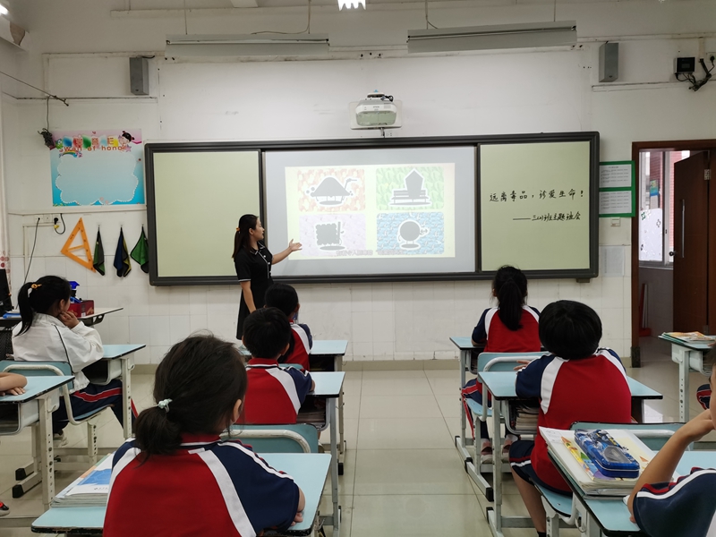 本次班会首先以视频激趣,分别是“不要让‘我以为’变成‘我后悔’”、“小学生为什么会染上毒品”、”识别毒品”,形象生动地让学生了解相关禁毒知识。接着各班班主任分别就各班情况进行禁毒教育,宣讲毒品的巨大危害。