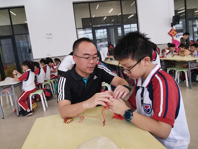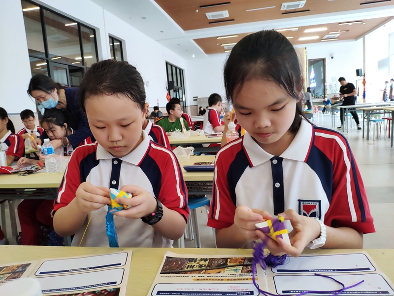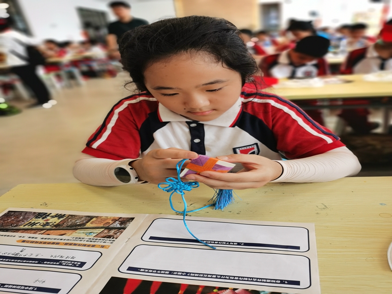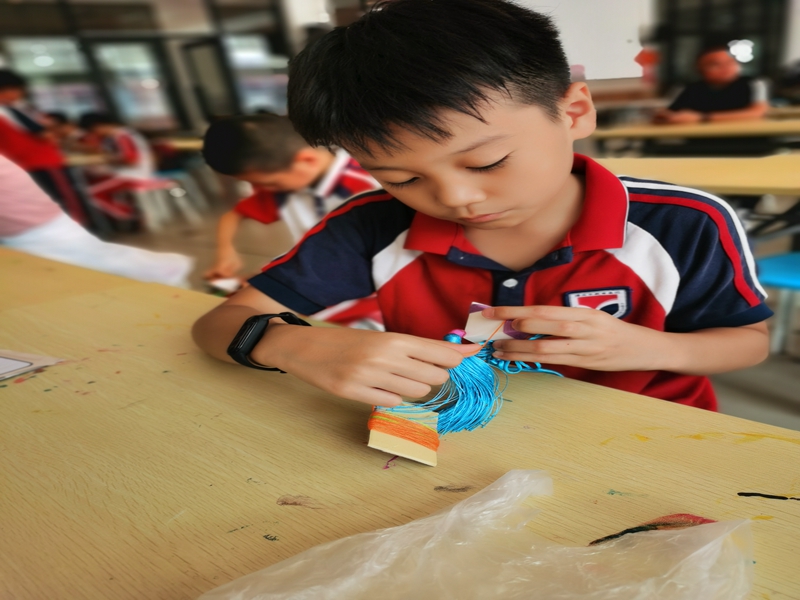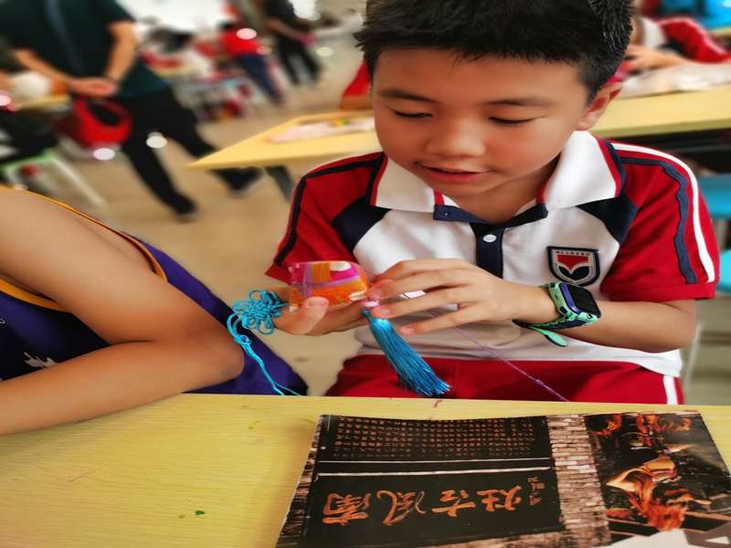 千年岭南文化,尽在古灶一日。孩子们在体会完醒狮之雄浑后,又来感受香包之秀美。在老师宣布开始制作香包后,他们个个都迫不及待地拿出材料,就着老师的教法,学着老师的样子,如武林高手一般动作迅猛,眼神专注,很快就学会了方法。