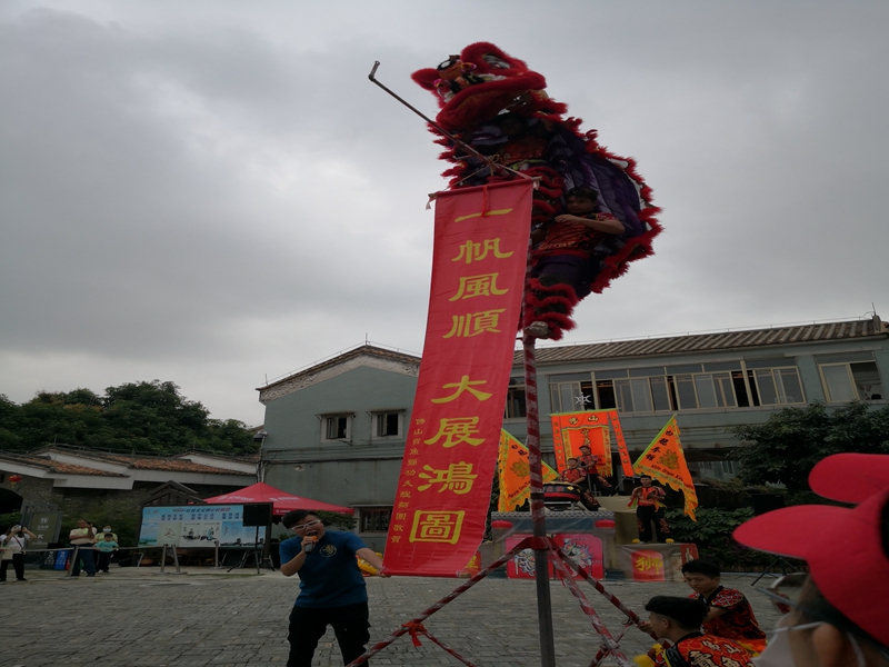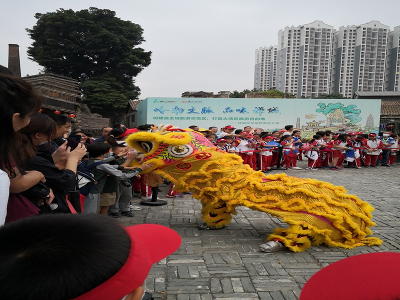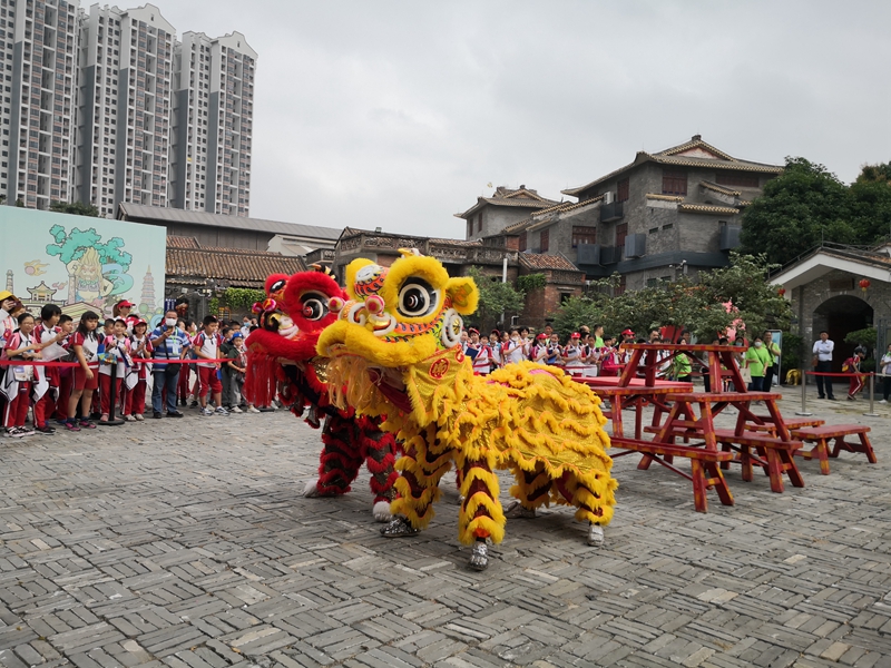 醒狮表演是岭南文化的重要组成部分,也是非物质文化遗产,当然吸引了同学们的兴趣。狮子是由彩布条制作而成的,每头狮子都由两个人合作表演,一人舞头,一人舞尾。舞狮者以各种招式来表演南派武功,富有阳刚之气。同学们看得如痴如醉,现场叫好声一片。