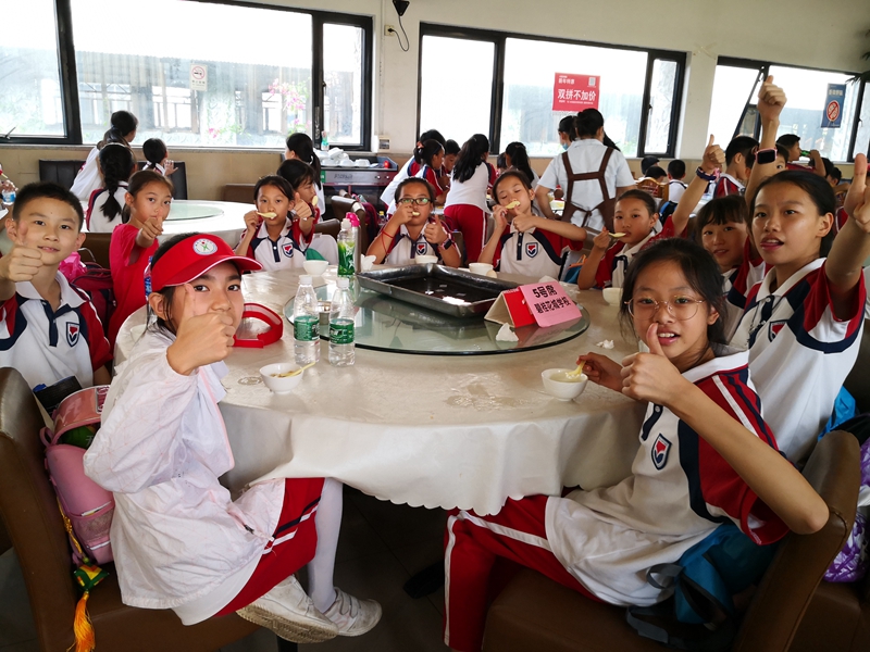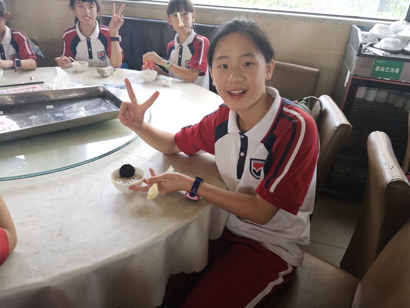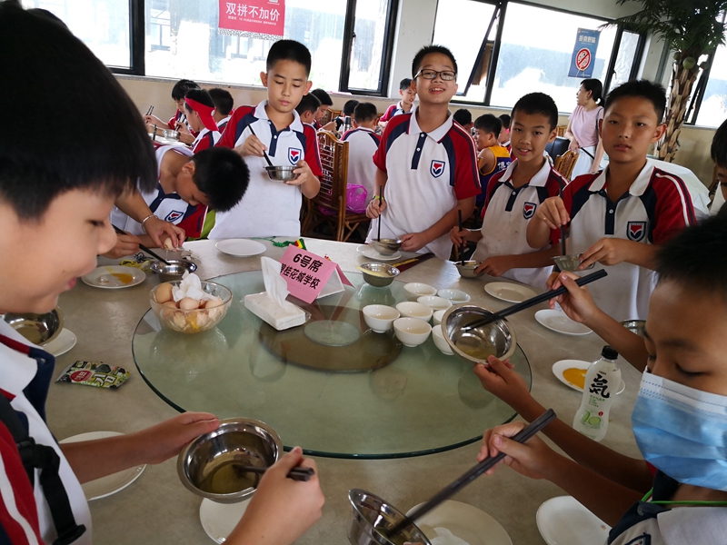 玩累了,自己做一份双皮奶解解馋吧。打蛋分离蛋清、打发、放糖搅拌、调和水牛奶……每一个步骤都必须认真细致地完成,否则就蒸不出这道岭南传统美食了。小吃货们那份认真的模样儿真惹人喜爱。经过五分钟的高温蒸煮,一碗碗滑滑嫩嫩的双皮奶就出炉了。学生们赶紧端起来品尝这亲手制作的双皮奶,真是唇齿留香,甘甜存心啊!