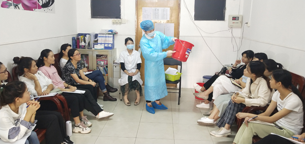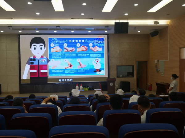 本次培训洪医生重点讲解病例呕吐物应急处置流程。从人员管理过程中如何将无关人员进行有序疏散、对呕吐病例如何安全转移,消毒前准备,做好个人防护、开窗通风、药物配制;对呕吐物处理及环境消毒,消毒后工作,个人防护用品处理、清洁用品的处理、手部清洁、消毒记录、健康监护等几方面进行详细讲解与示范,最后给在座人员再次播放诺如病毒呕吐物处置的指导视频,让大家再次巩固培训内容要点,熟记呕吐物处置流程。