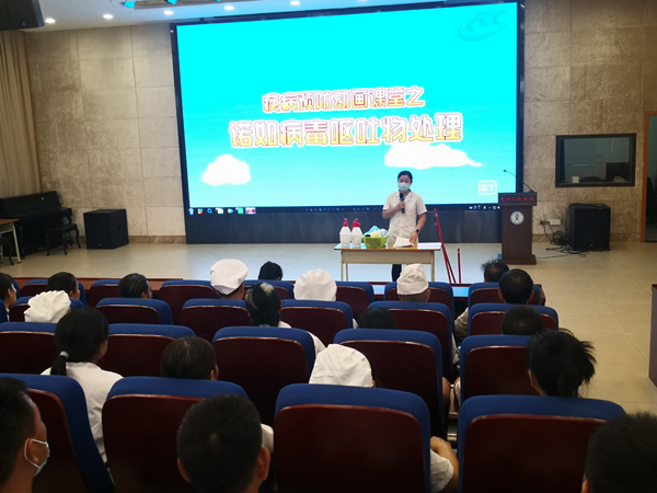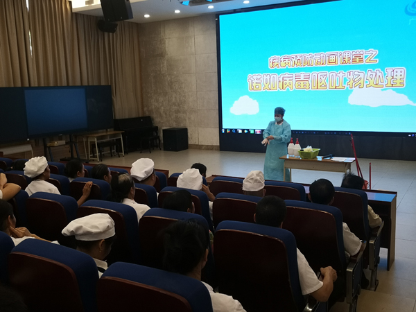 最后,洪医生重点强调:1、员工如有疑似症状一律不能带病工作,要及时到正规医院进行诊治并按隔离要求居家休息,待症状消失72小时后才能上班,患病员工信息要上报学校;2、对患病者的呕吐物或排泻物要专人用专用工具进行消毒处理,处置者要做好个人防护,按要求配带口罩、手套、一次性帽子,穿一次性防护服,套一次性鞋套,处理后要彻底用洗手液洗手、消毒;3、配备消毒液要按量化配比的水位标准执行;4、消毒后要对清洁用具、防护用品进行消毒同时做好健康监护。5、学校传染病防控是每位教职工的责任,大家一定要提高防控意识,认真负责地对待防控工作。