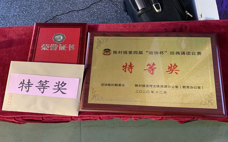 比赛当天,花城学子穿着靓丽整齐的服装,充满自信的表现,高水平的朗诵,给在场的评委、观看的师生们留下了深刻的印象,最终在众多节目中脱颖而出,取得全场最高分,获得陈村镇第四届“政协杯”经典诵读大赛特等奖。