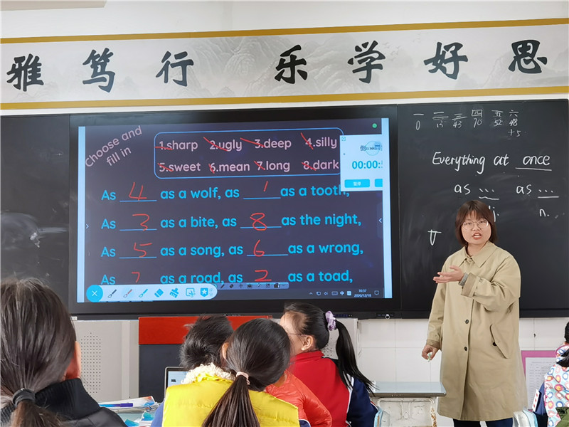 李斯老师通过歌曲《Everything at once》贯穿整节课,学生们在轻松愉悦的氛围下学习和操练“...as...as...”的用法,课堂问题设计有梯度,有难度,充满趣味,连听课老师也被吸引住了。