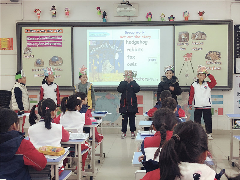 刘允立老师利用brain storm的形式,迅速领学生进入绘本《It was a cold dark night》的角色,熟读故事后,刘老师马上组织小组合作扮演,学生们学中玩,玩中学,不亦乐乎。