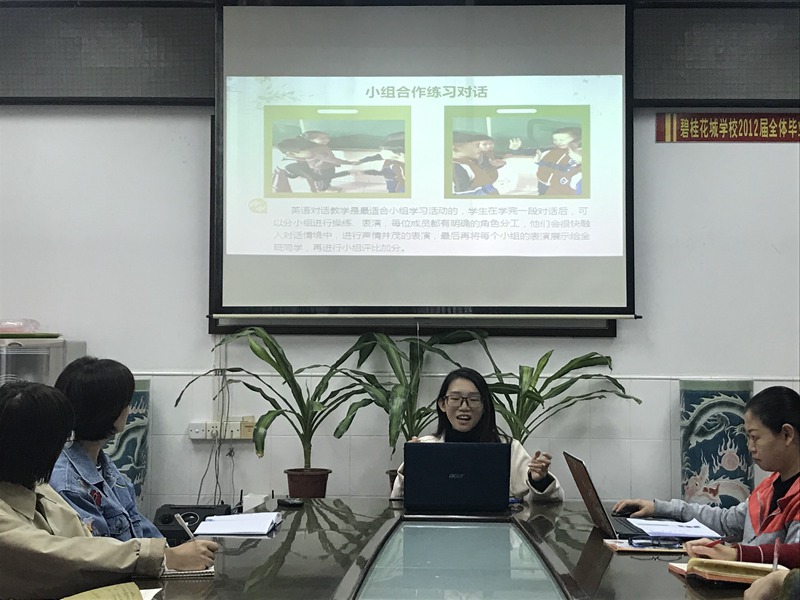 2020年12月17日下午,我校英语科组召开了教研例会。一年级的梁婉珺老师向英语组的老师们分享了她在一年级英语课堂上小组合作的方法。梁老师从小组合作学习单词、小组合作练习对话、小组合作玩游戏、小组合作制作海报这四种合作形式进行分享。