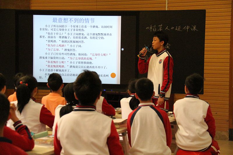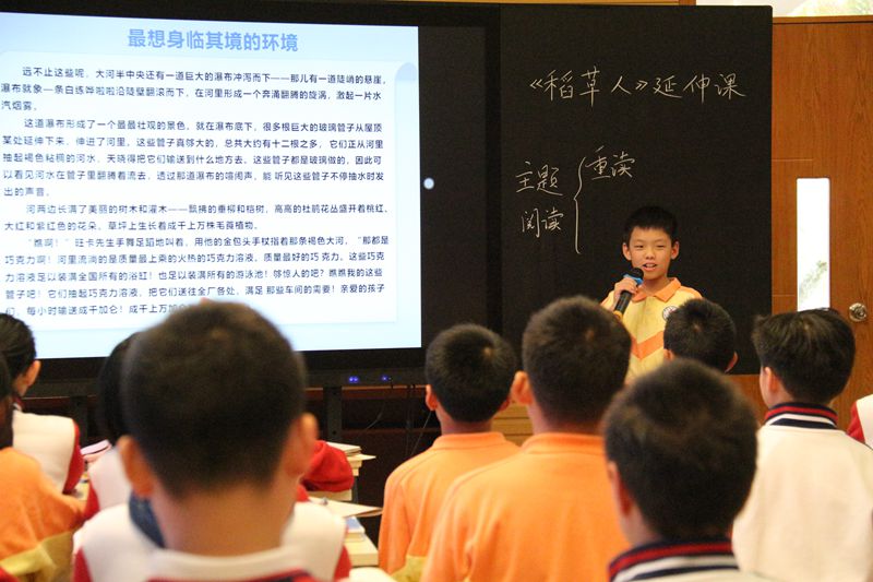 第一环节是杨倩桢名师工作室与顺德区曾雯名师工作室的成员献课,第一节授课的是碧桂花城学校的郭园主任。她上的是《稻草人》整本书阅读的延伸课。在此之前,她上过了《稻草人》整本书的推进课和分享课。这次的延伸课,她希望学生通过重读,能从读懂一本书到读懂一类书,学会主题阅读。课堂的重点环节是学生的分享,课前郭主任布置学生重读了一些童话书,要求他们学着用PPT,以童话三要素为主线,梳理自己的阅读感受,然后投票选出优秀作品,得票数前三的学生现场展示PPT,并且把感受说给大家听。课堂的另一个重点环节是阅读比较,把叶圣陶先生的童话跟其他作家的童话比较,找出所有不同的比较对象,以同一比较对象为标准,现场进行组队,十秒选出组长和记录员,每组发一张用于比较阅读的思维导图,进入小组合作学习。老师大胆的设计、学生们的精彩的分享获得了老师和专家们的高度赞誉!