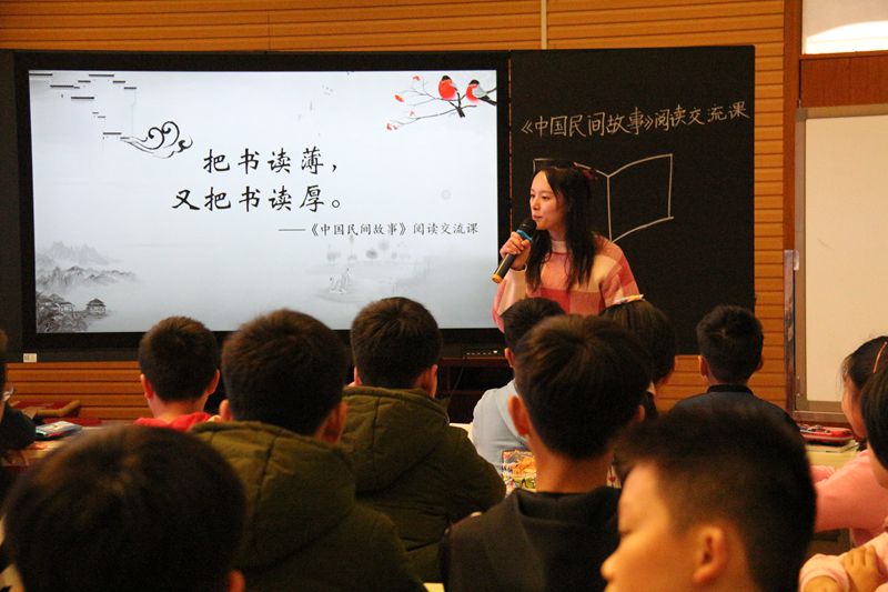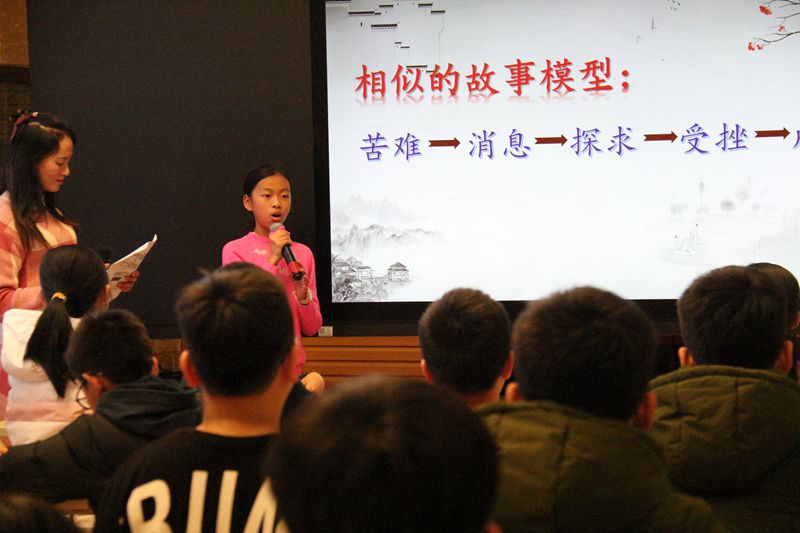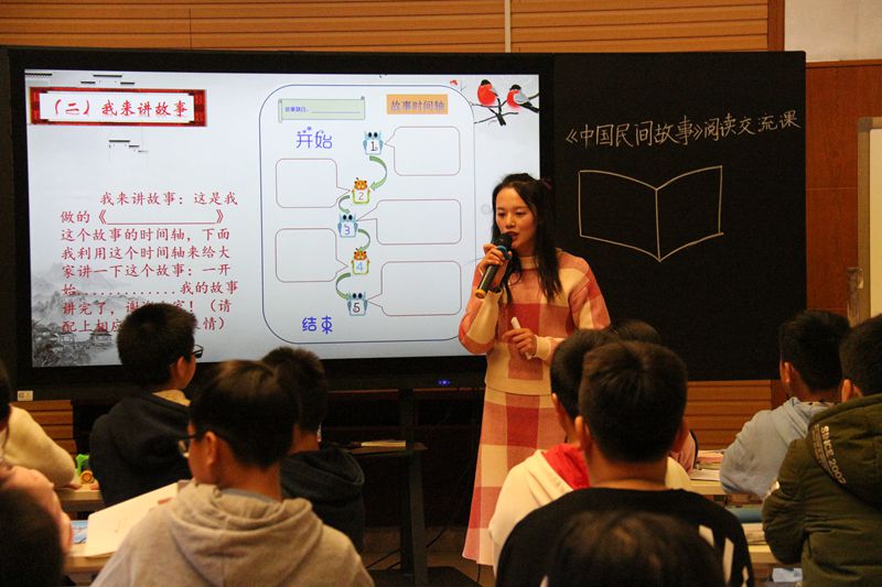 第二节授课的是北滘镇中心小学的林珊珊老师。她上的是《中国民间故事》整本书的阅读交流课。林老师以“故事时间轴”策略引领学生大胆讲述自己喜欢的民间故事,然后分析出这些民间故事的“故事模型”。随后她把《中国民间故事》里的故事分成四类,让学生找出这些故事的共同点:勇敢坚持类、爱情故事类、有勇有谋类、勤奋刻苦类。她用这样的方式告诉学生,阅读时可以用找“故事模型”和“主题归类”的方式把书读薄,引导学生阅读两个不同版本的《华佗学医》,通过不断追问的策略和阅读思考,告诉学生还可以用这种方式把书读厚。