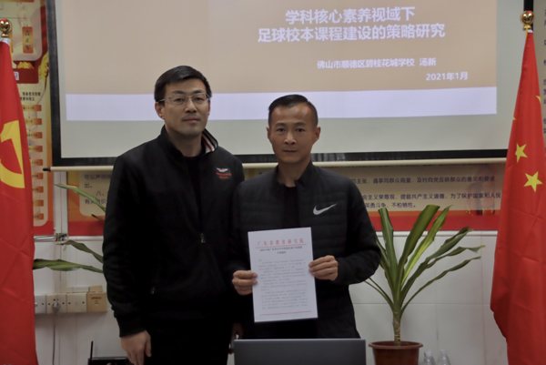 会议中,顺德区教育局体育专干刘罡老师宣读并颁发课题立项通知书。