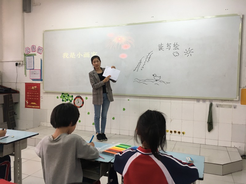 接着,焦老师率先为年级组的老师们上了一节题为《瓜娃娃》的“读写绘”示范课。焦老师亲切的语言,有趣的朗读,精美的课件……都深深吸引着孩子们。在“我会写”的环节,孩子们的想象更是天马行空,爱心瓜、榴莲瓜……孩子们争相发言,创编出一首首灵动的小诗,写话的升华真正体现了前期焦老师指导朗读的效果。最后,孩子们根据自己创编的小诗配上精美的图画,绘出了他们眼里最单纯的世界。在焦老师的引领下,一年级的老师们对开展“读写绘”有了更清晰的思路。