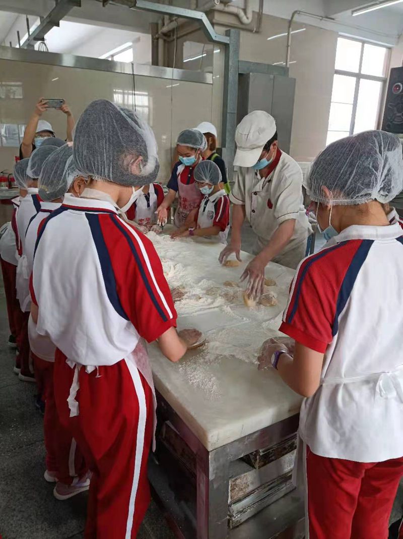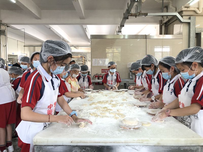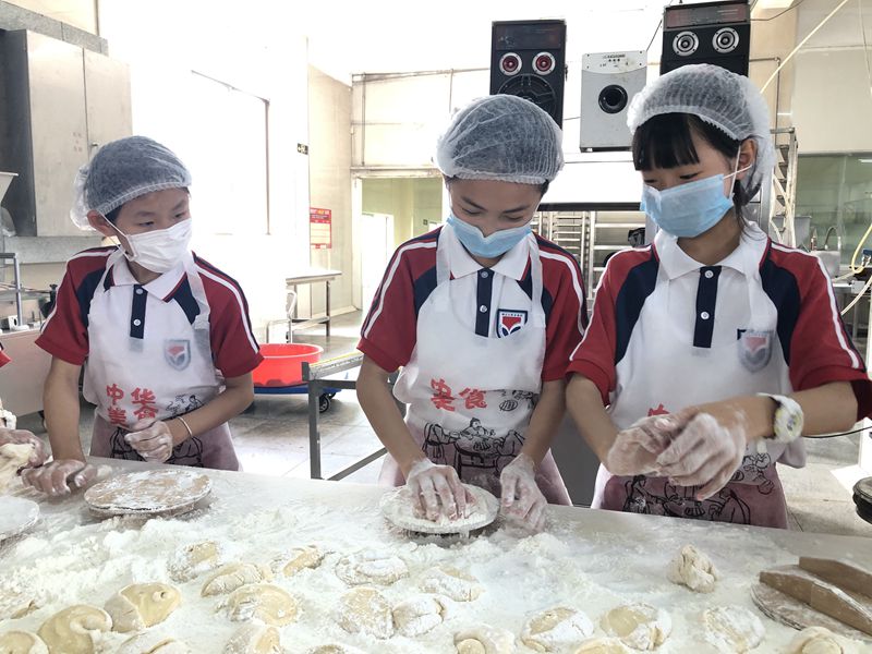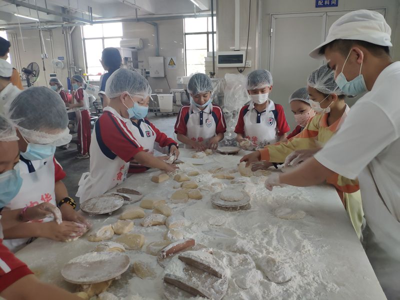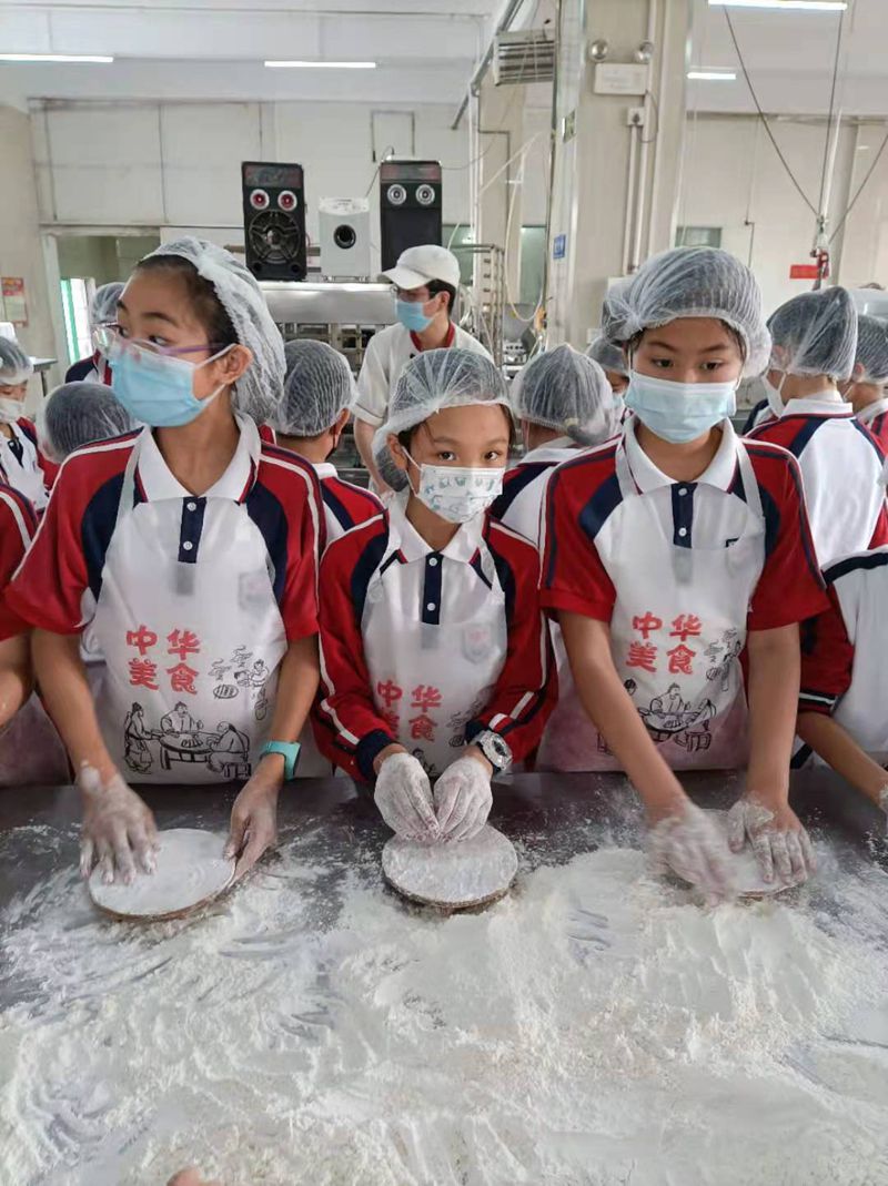 同学们回忆师傅示范的制作流程并开始制作西樵大饼。将大饼捏、按、擀,撒粉,每一步都不能忘记,我们专心致志地按着流程制作大饼,细致入微的神情让人看了不尽感动。