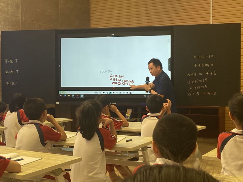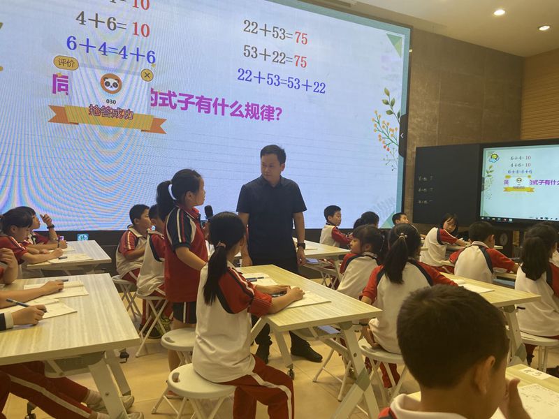 数学组卢勋辽老师执教《加法交换律》一课,从口算比赛引入新课,运用智慧平台的纸笔互动功能,更是激发了学生的学习兴趣。通过学习,学生仿写了加法交换律的式子并用字母或图形非常有创意地表示加法交换律。卢老师运用智慧课堂,与学生默契互动,大大提高了学生参与课堂的积极性。
