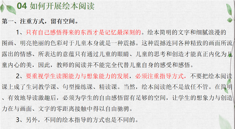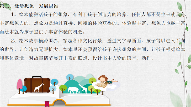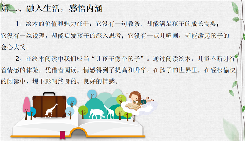 接着,李老师就如何开展绘本阅读进行分享。我们应当注重方式,留有发挥想象的空间;融入生活,感悟内涵;激活想象,发展思维。关于绘本阅读,关键字应该都在于“读”。读,是前提,是基础,是过程。尊重学生的阅读体验是首要目标。