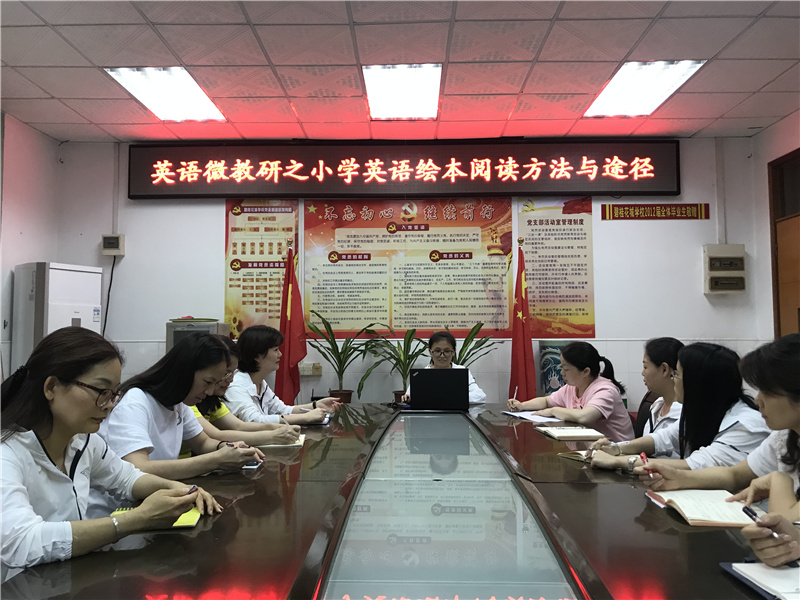 4月29日下午,碧桂花城学校英语科组所有老师准时来到会议室,一起开展英语微教研活动。本次活动由李小平老师主讲,围绕“小学英语绘本阅读方法和途径”进行讲解。