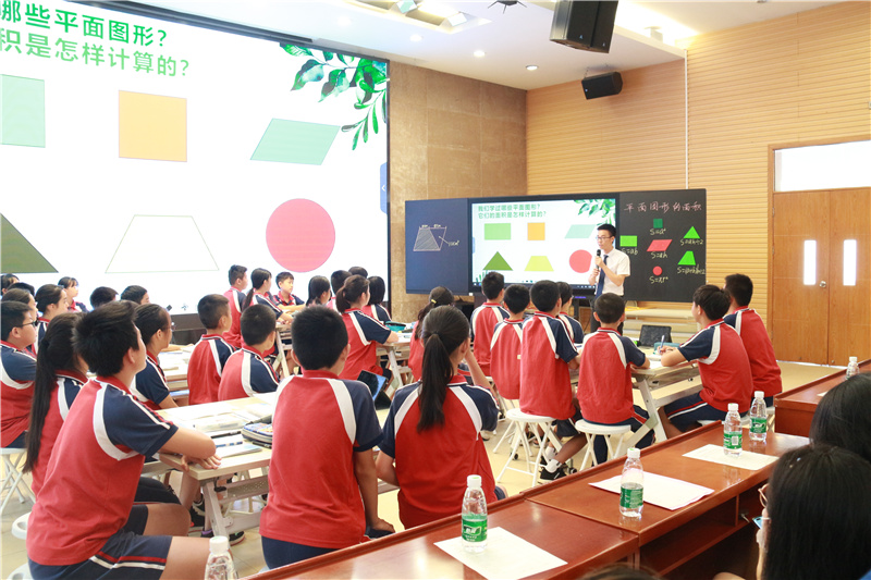 三年级的家长会活动在学术报告厅展开,先由李家宝老师上一节智慧课堂的数学展示课,课题为《平面图形的面积》。李老师娴熟地利用科技手段,充分调动学生课堂学习的积极性。他先让学生小组合作,罗列出平面图形的相关知识点,再用平板拍照上传到大屏幕,整个流程彰显了技术的先进性。学生在课堂上用智慧笔抢答、对他人进行评价、完成练习,智慧课堂再利用柱状分析图进行数据分析。不论是教学的构造,还是练习的设计,都展示出了智慧课堂的创新技术,令在场的家长们叹为观止。