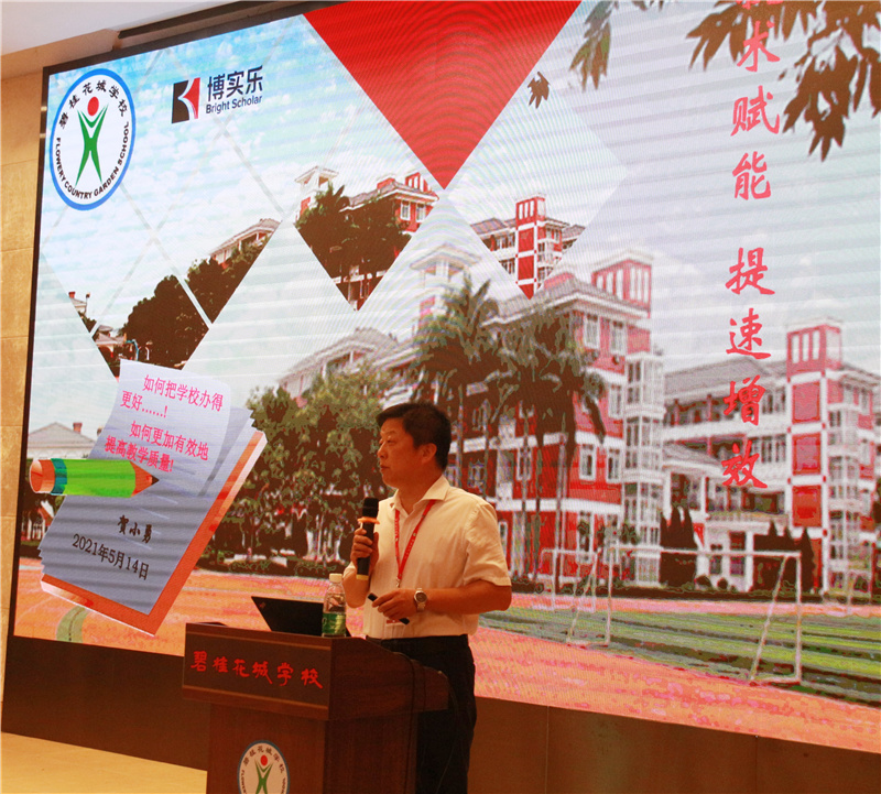 课堂结束后,家长们还倾听了我校贺小勇校长《科技助力,提质增效》的主题讲座。贺校长对花城学校的研学、智慧课堂、交换生等课程项目着重进行解析,这些课程项目都彰显了花城学校先进的教学理念和丰富的教学活动。“智慧课堂”是通过常态化使用大数据分析支撑的智能教学应用,实时采集、分析多维度、全方位、有效性的数据,帮助学生实现基于人工智能的个性化学习计划的定制,是将教师从知识的传授者向学习的指导者转变,建立以学习者为中心的教学新模式。贺校长着重指出:花城学校自2019年9月将“智慧课堂”建设引进到学校部分班级以来,不断推进“科技强校”的发展计划与“智慧课堂”建设的教学理念。我校也会不断加大硬件设施上的投入,为学校的智慧课堂项目长远发展提供保障和支持。