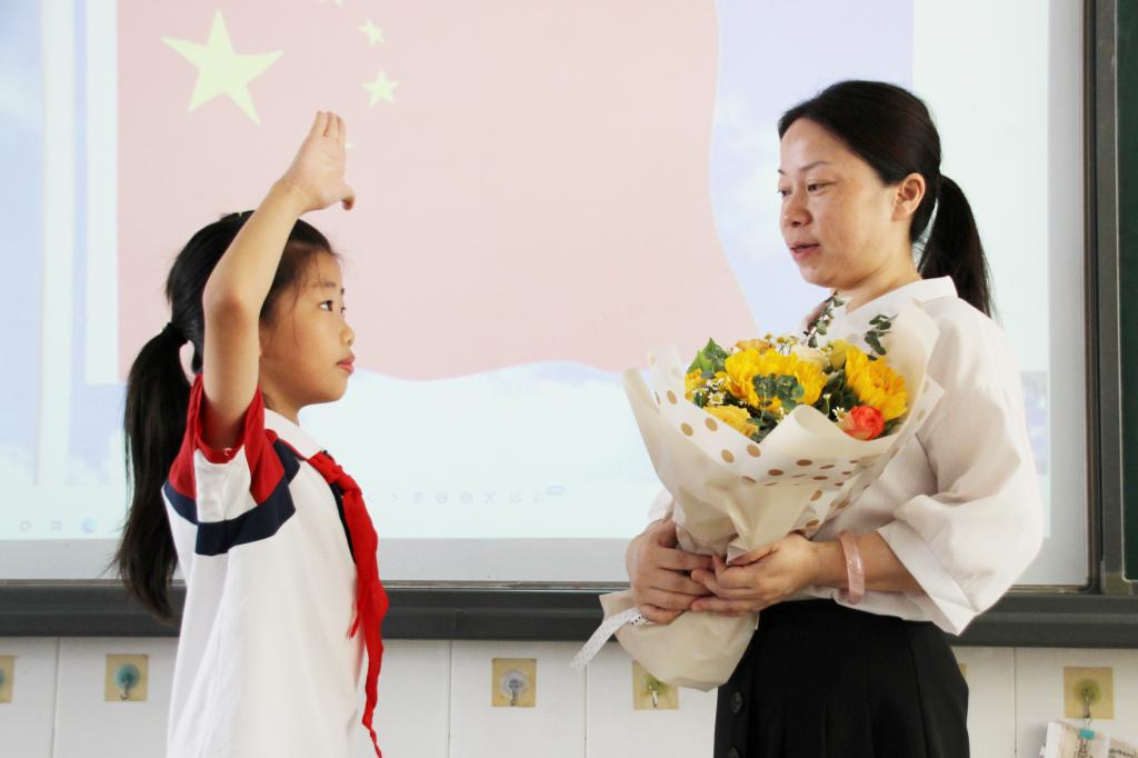 在鲜艳的国旗下,学生代表和德育处郭园主任分别作《班主任,我们爱您》《致敬最美班主任》主题发言。随后,学生代表为每一位班主任献上了一束鲜花并送上诚挚的祝福,这也将开幕式推向了高潮。