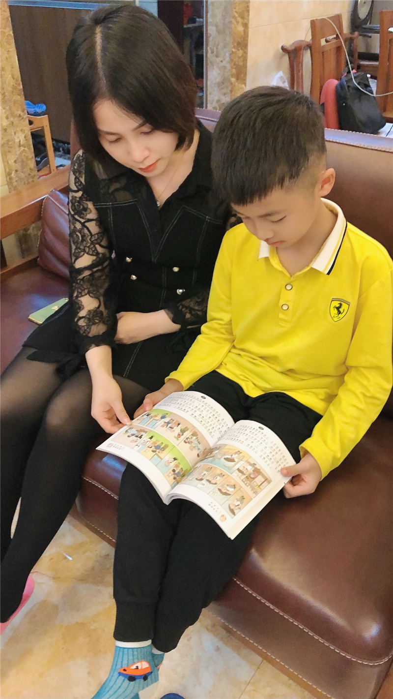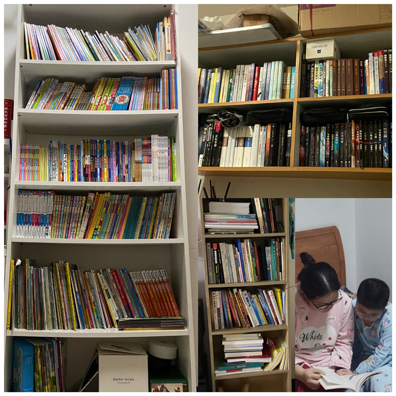 家庭藏书量大,种类繁多。以培养孩子的终生阅读习惯、深度理解与思考能力为目标。每天有固定的家庭成员阅读时间,外出时必提醒孩子随身携带书本,可随时随地阅读。计划在一年级暑假开始,逐步引入国学经典及名人传记,增加英语分级阅读相关书籍。