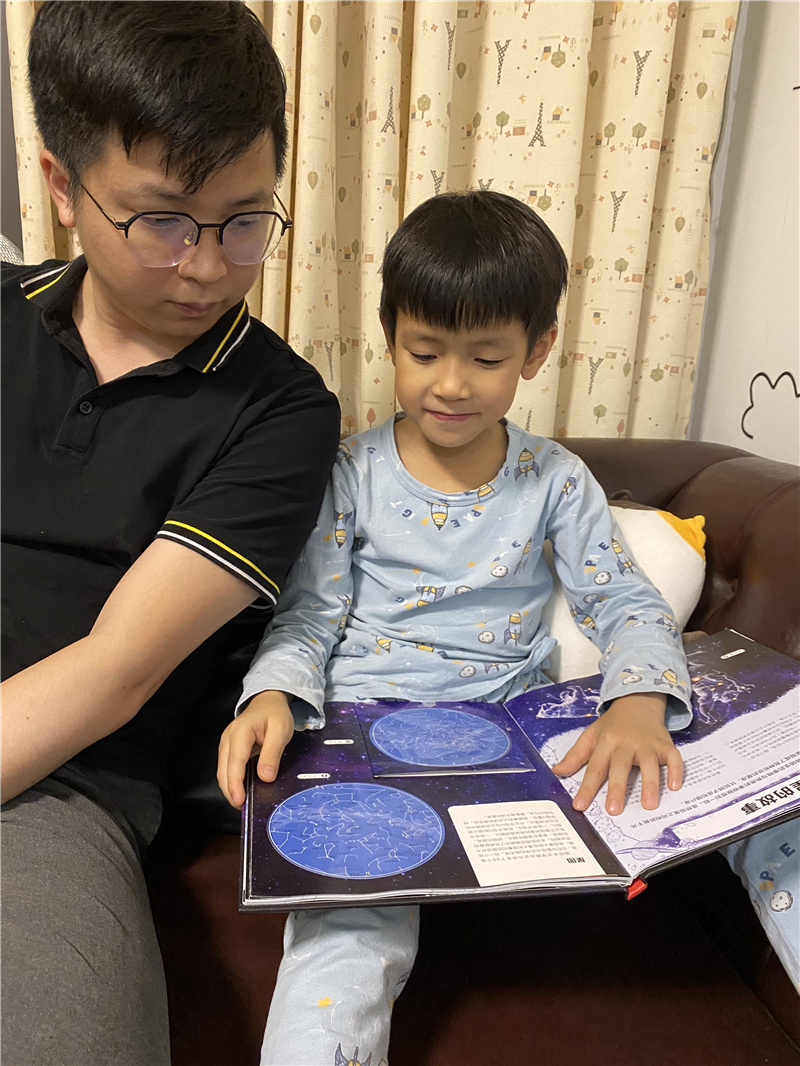 家庭藏书丰富,以少儿系列图书、名著、科普类书籍为主。家中读书氛围浓厚, 每天睡前保证30-60分钟的亲子共读,每周日去书店读书或图书馆借书。家庭活动间隙会听书,孩子在上小学前就已经听完了《西游记》、《三国演义》、《水浒传》、《故宫里的大怪兽》等书籍。