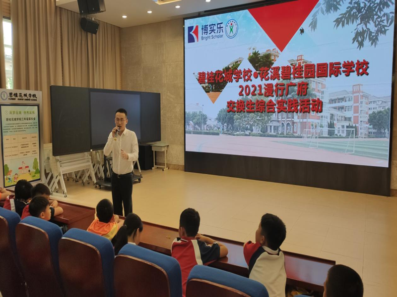 碧桂花城学校田桂花副校长在致辞中介绍了交换生项目的缘起。为了此次项目,两校于2020年10月成立了项目组。策划历时近8个月的时间,才有了今天的交换生之旅。一路上,老师们精心呵护,悉心陪伴,希望孩子懂得感恩,珍惜这难得的体验机会。田副校长给参与项目的孩子们提出了几点建议:要有规则意识,严格要求自己;要是规划意识,不管是学校的学习还是外出的拓展,都要有计划、有跟进、有反思并预祝孩子们能在此次活动中收获满满。