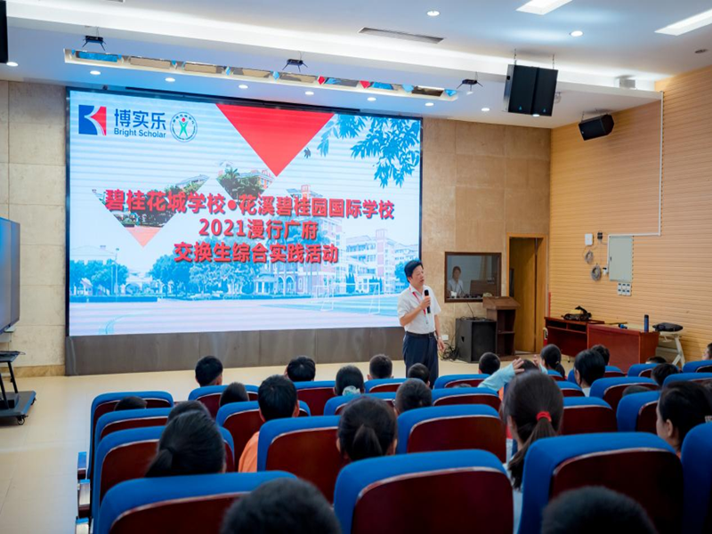 首先是碧桂花城学校的贺小勇校长发表欢迎致辞,贺校长指出本次活动旨在促进同学们开拓视野,丰富成长体验,希望同学们在这次活动中能够坚持吃苦耐劳的精神,团结互助,体会不同生活环境和历史底蕴下的岭南文化。
