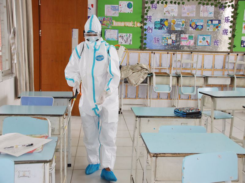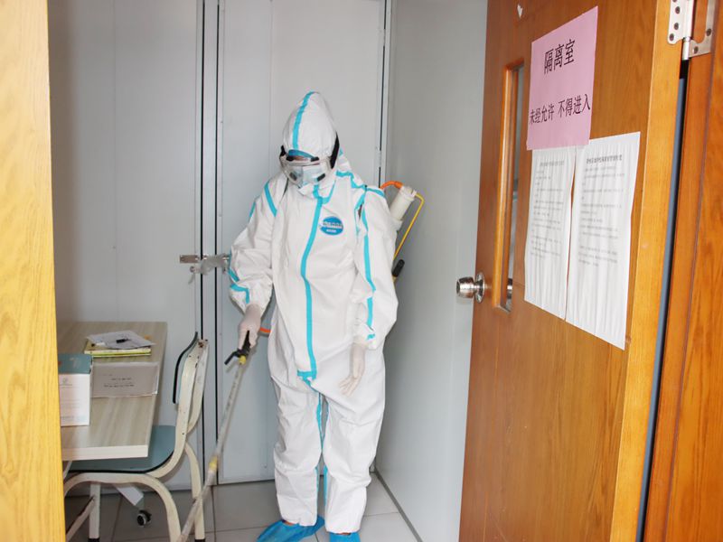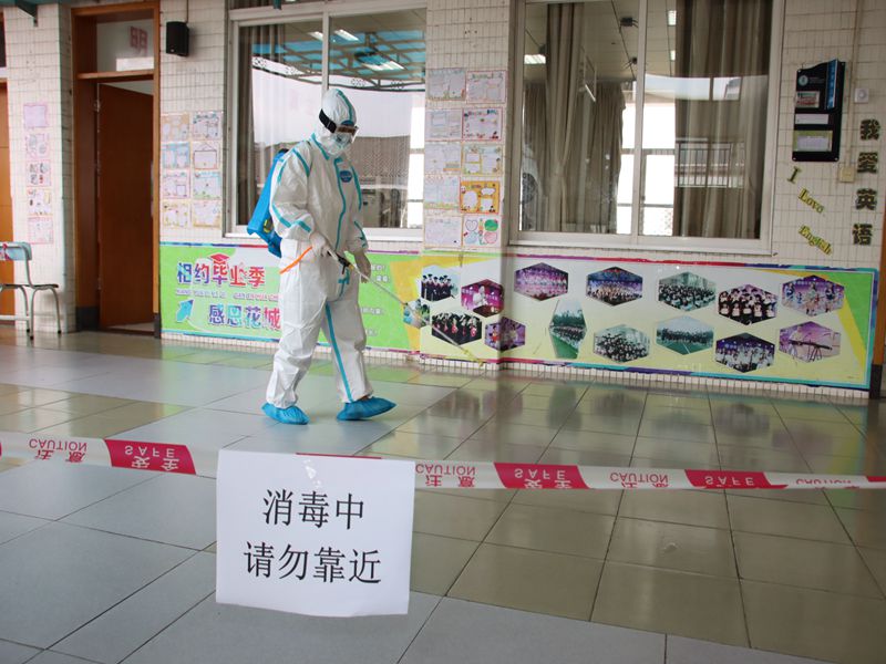 校医接到报告后,穿好防护服,到达教室将发热学生从发热通道带至临时隔离室,过程中保持距离。发热学生离开后,消毒组工作人员按要求对教室及走廊做好消毒工作,并拉好警戒线,做好隔离。