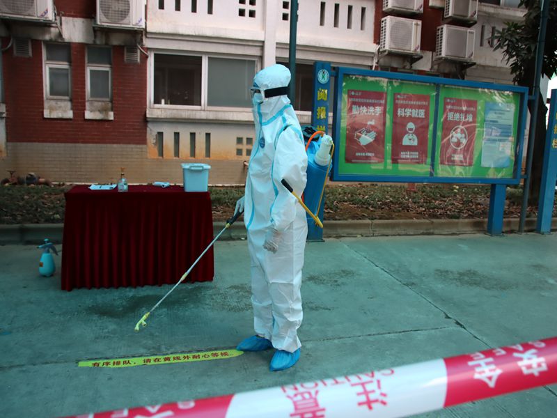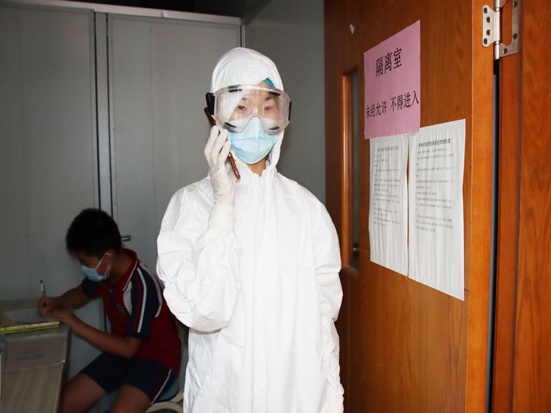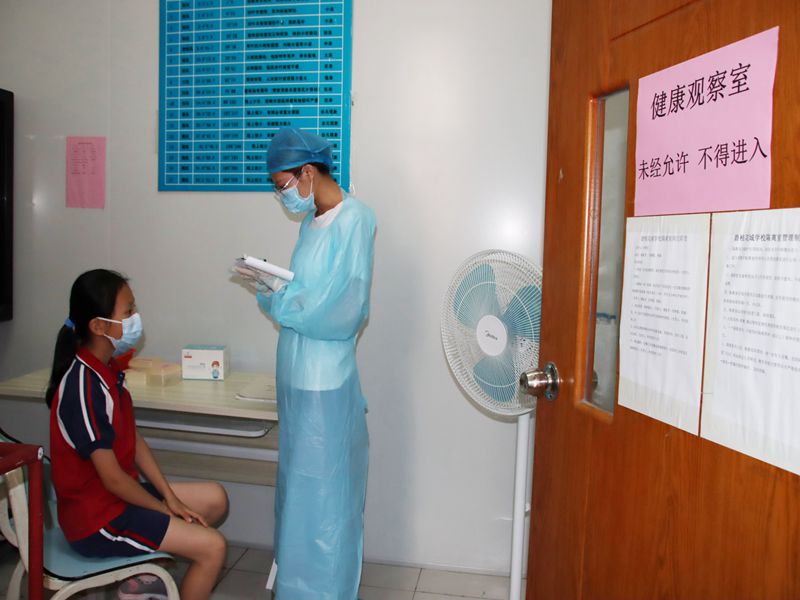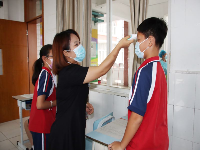上课期间,当任课老师发现一名学生出现发热情况时,老师马上使用额温枪进行测温,确定这名学生发热后,将情况报告给班主任和校医。在校医到达教室前,班主任和任课老师让班级里所有学生佩戴好口罩,引导其他学生有序转移到备用教室,继续进行测温排除。
