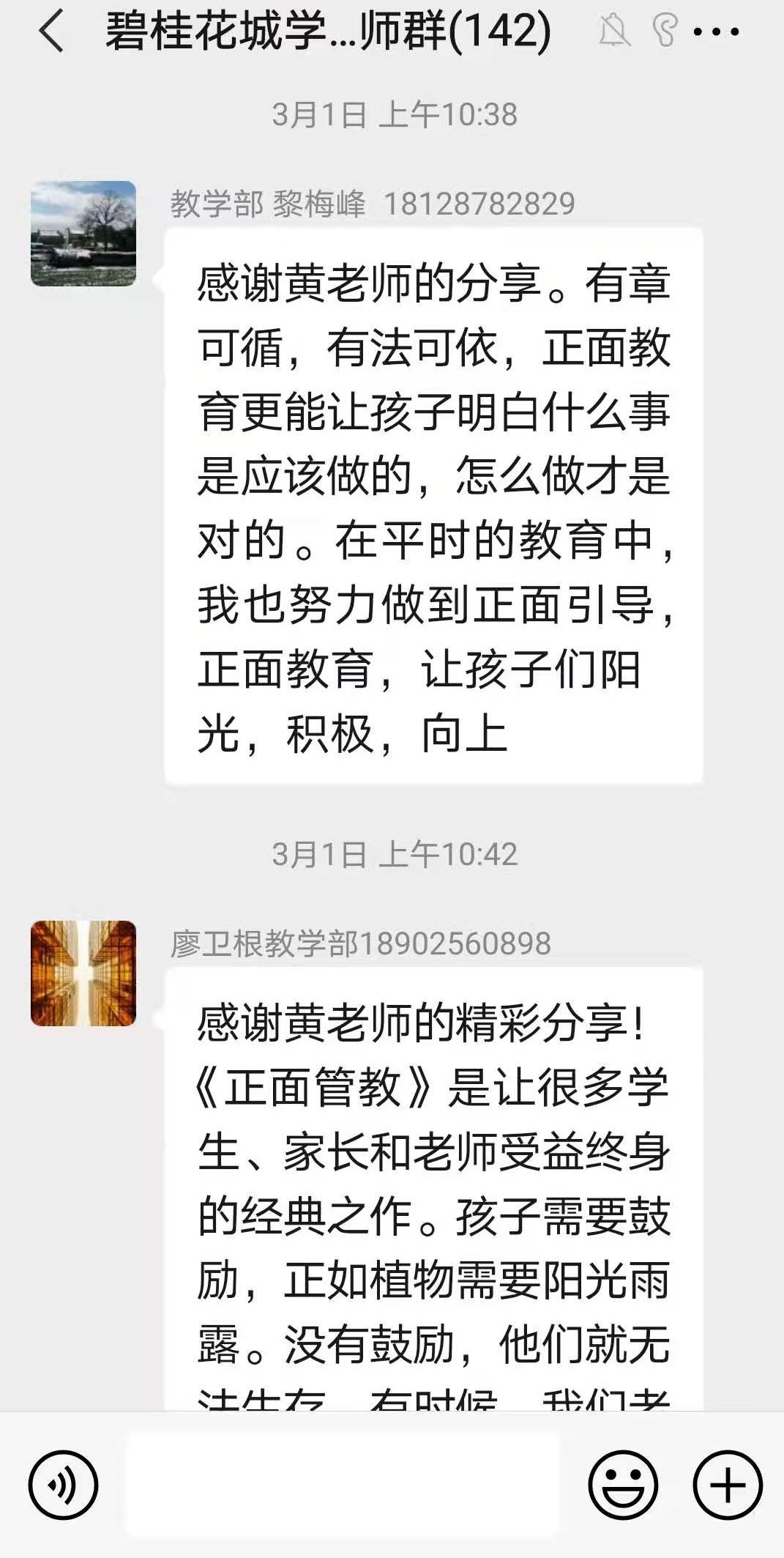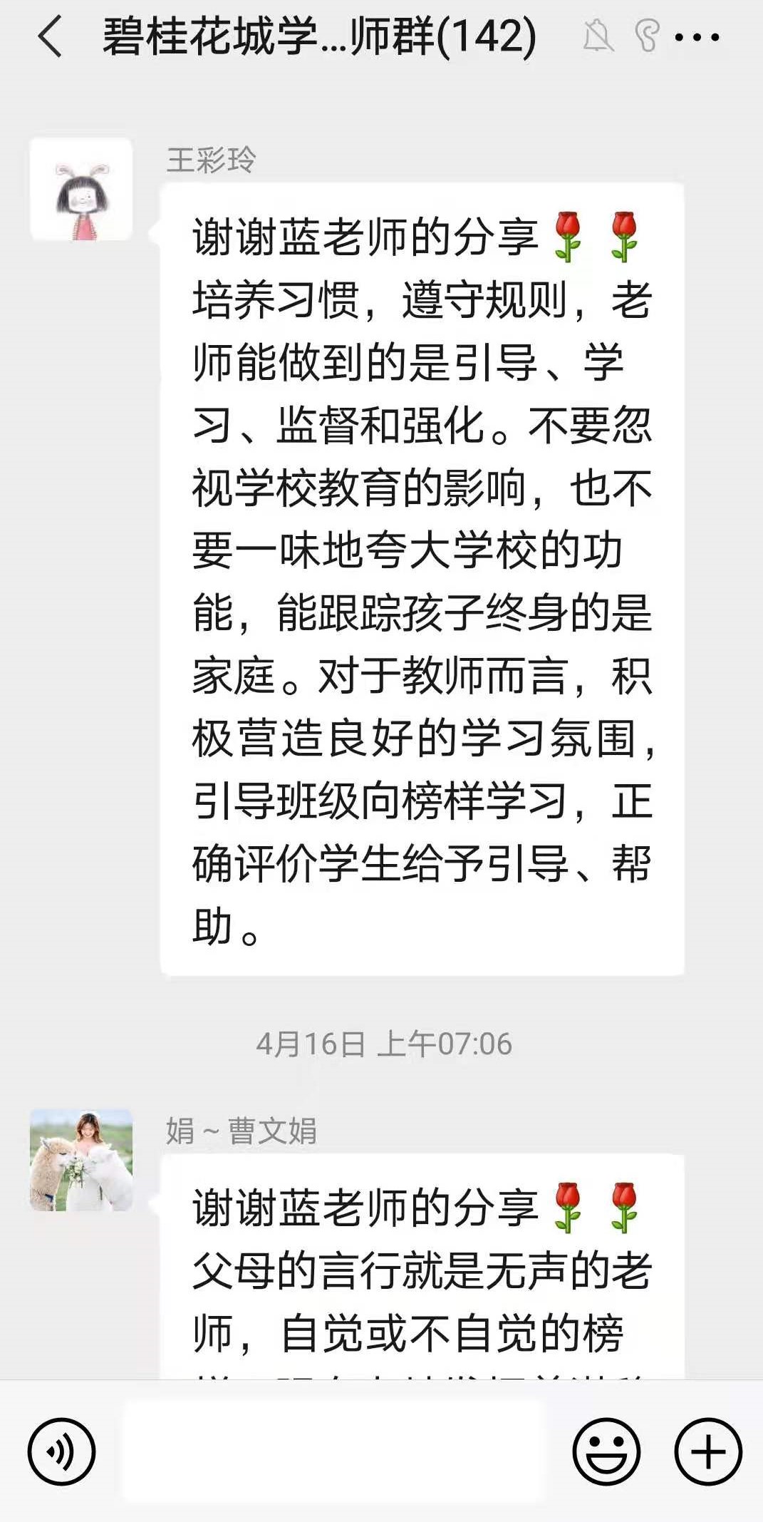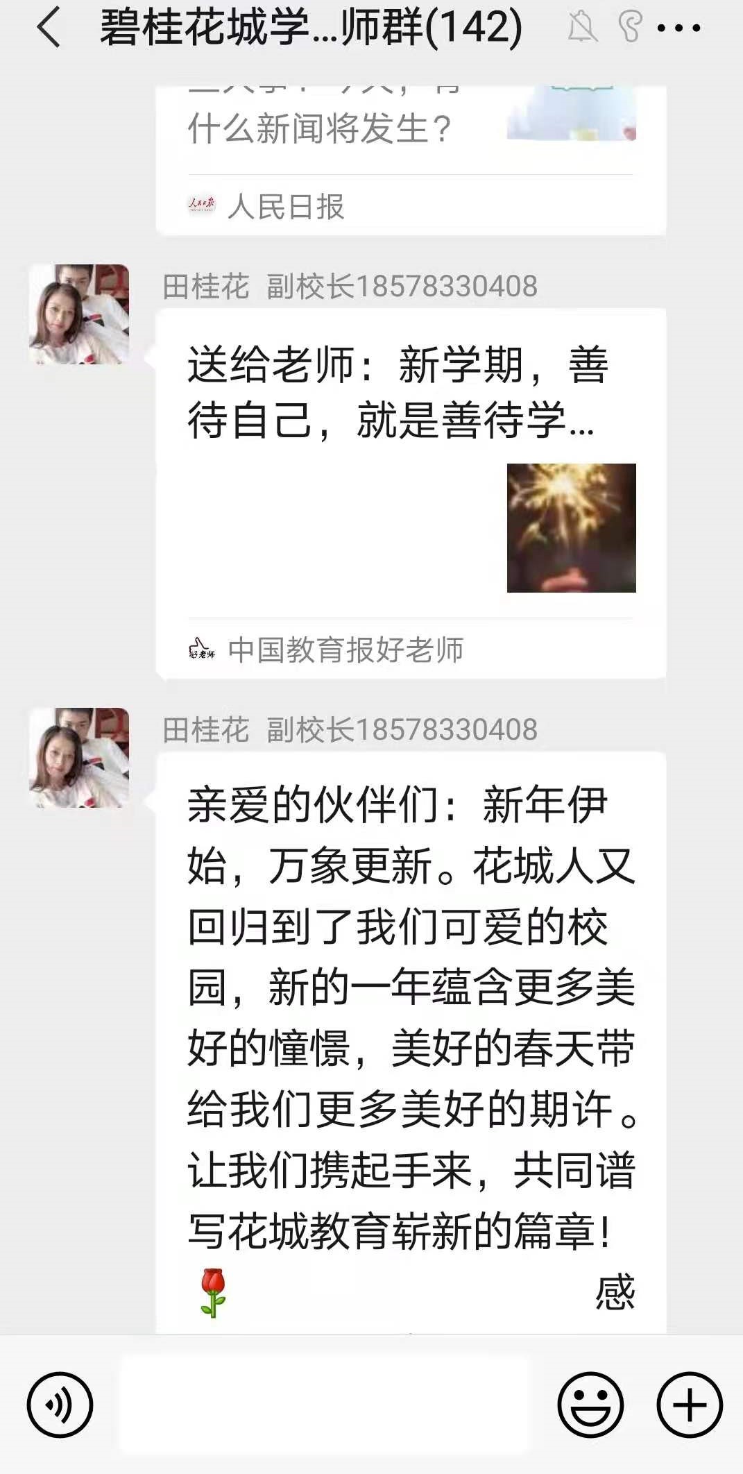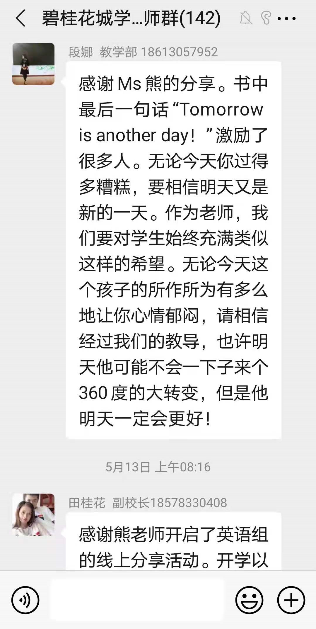 为了引导广大教师以德立身、以德立学、以德施教,做“有理想信念、有道德情操、有扎实学识、有仁爱之心”的好教师,树立良好的师德教风,成为学生健康成长的领路人,本学期碧桂花城学校开展了“教师晨读分享活动”。所有教师在工作日清晨9点之前,轮流在学校教师群里进行每日新闻和美文推送分享,分享老师说明推荐美文的理由和自己的感悟。其余老师阅读后也在群里发表自己的感悟和体会,好不热闹!蓬勃的朝气,满满的正能量,园丁们开启了一天快乐的生活!