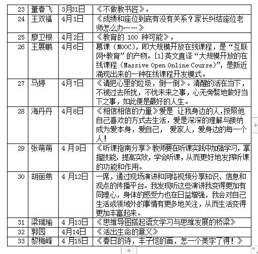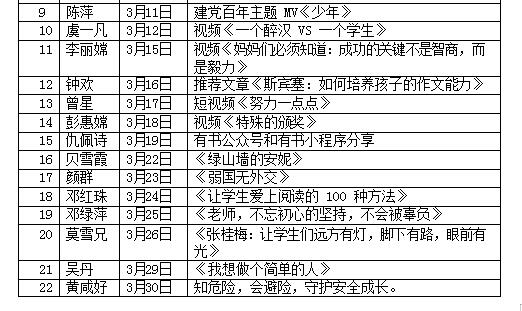 本学期老师们共分享美文及视频材料73篇,晨读分享活动的开展,有利于老师们共同探讨教学过程中出现问题及应对措施,拓展了老师们的学习空间,弘扬了校园正能量。大家共同分享成功和喜悦,共同解决难题和困惑,彼此获取教学信息和灵感,产生共鸣和凝聚力,碰撞产生出浓浓的校园情怀,在育人的道路上体验幸福、快乐和成长!