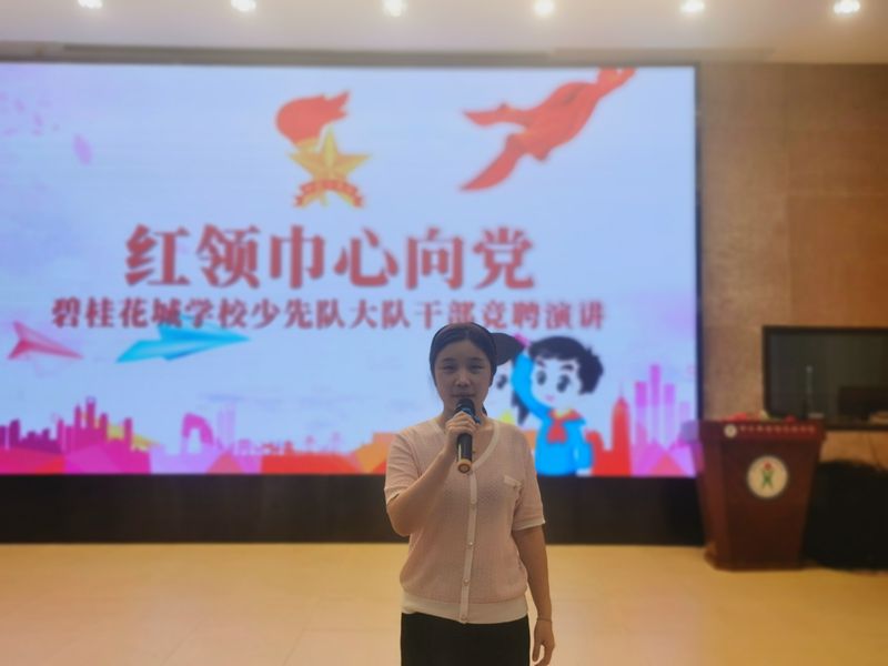 活动最后,碧桂花城学校德育处郭园主任对本次少先队大队委换届竞聘做了总结性发言,她高度赞赏了参选的少先队员的演讲,丰富且有特色,展示出了自己的风采,体现出了少先队员的良好风貌。郭主任还鼓励落选的少先队员,要做到不气馁,站在竞选台上就是成功,日后要不断精益求精,肯努力肯攀登,机会早晚是大家的。并在最后对竞选成功的队员给予厚望,希望他们严格要求自己,强调中国少年先锋队是广大少年儿童的成长摇篮,希望新一届大队委干部可以更好的利用这个平台,带领少先队员认真工作,服务大家!